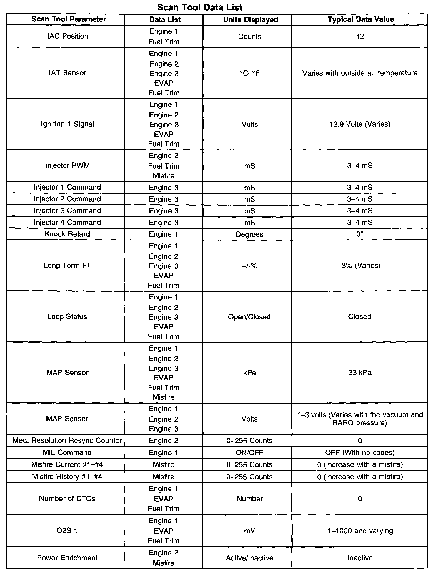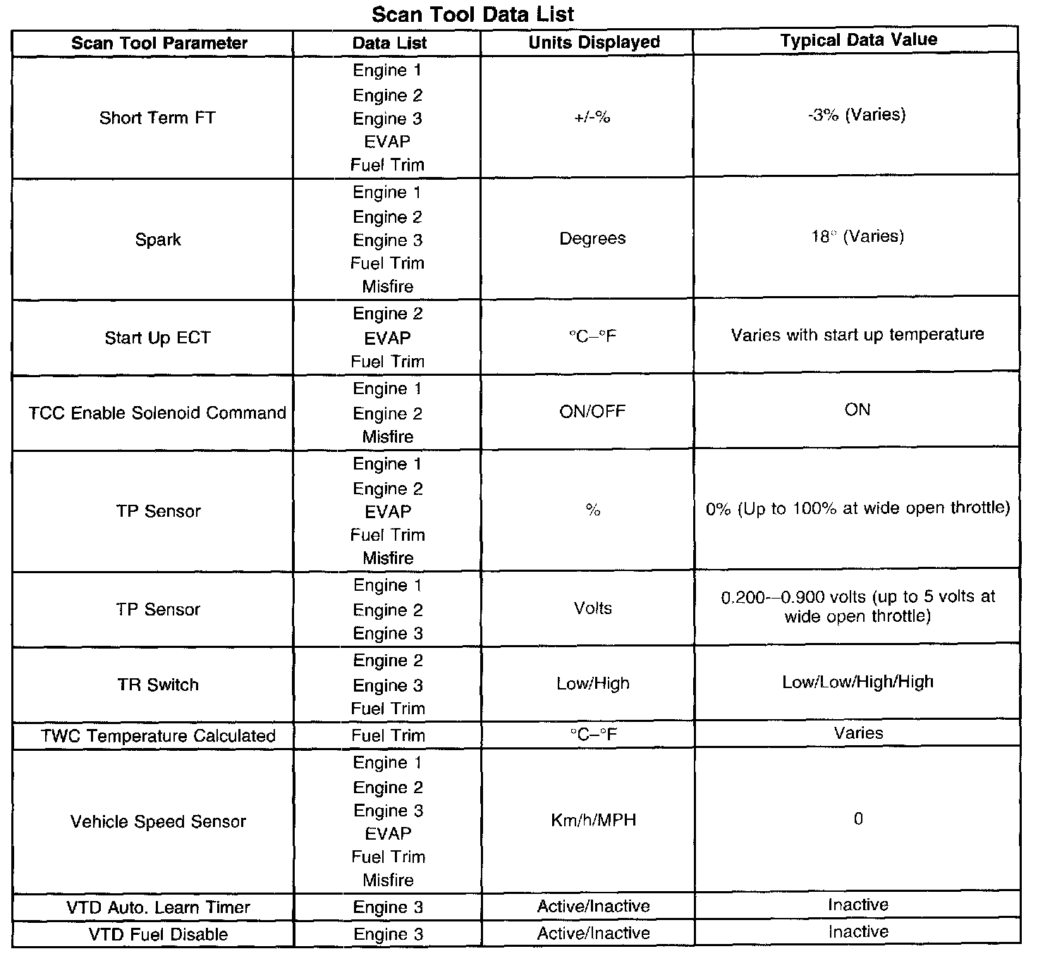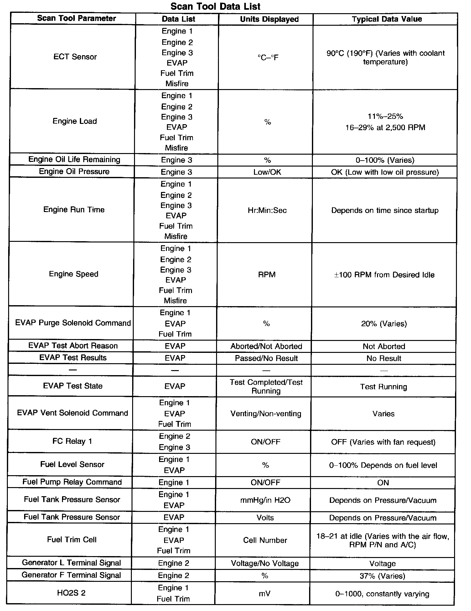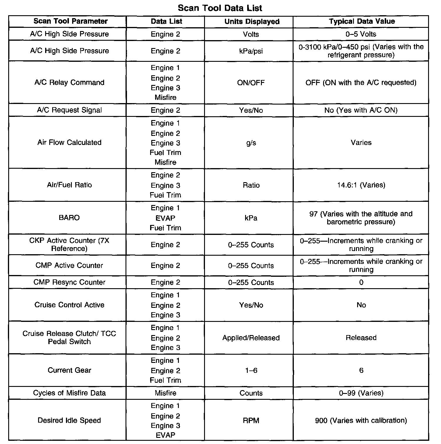 The Engine Scan Tool Data List contains all engine related parameters that are available on the scan tool. The list is arranged in alphabetical order. The parameters in the Typical Scan Data values column represent values that would be seen on a normally running engine.