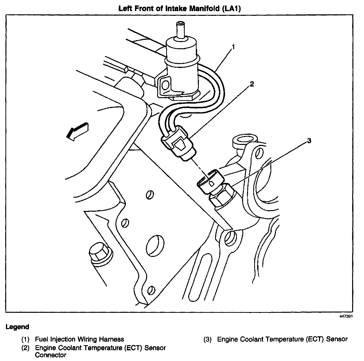 The Engine Coolant Temperature (ECT) Sensor is located on the left hand side, top of engine.