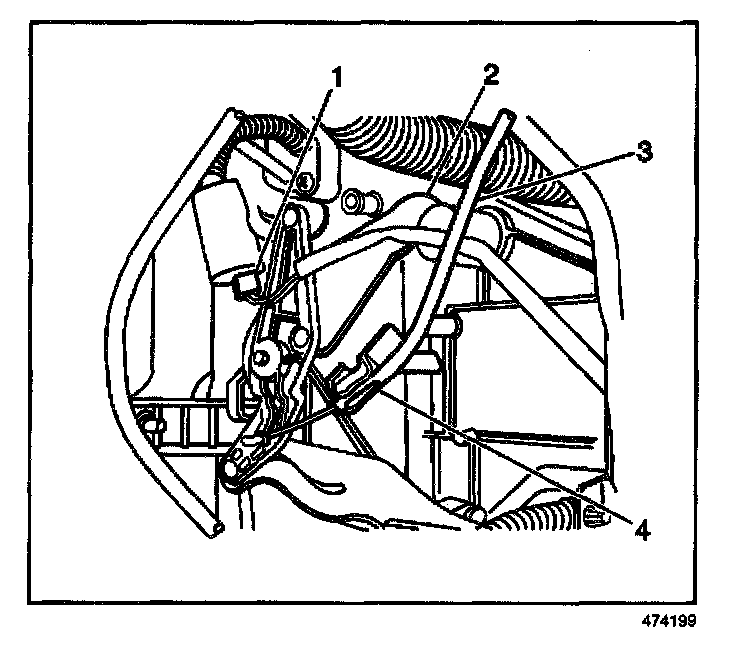 19.1. Gently pry the temperature control cable (4) sheath from the heater control unit. Unhook the cable from the lever arm.