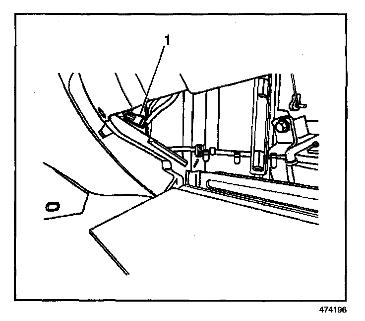 12. Install the fresh/recirc control cable (1) onto the pin of the fresh/recirc door and install the cable to the clip at the heater case.