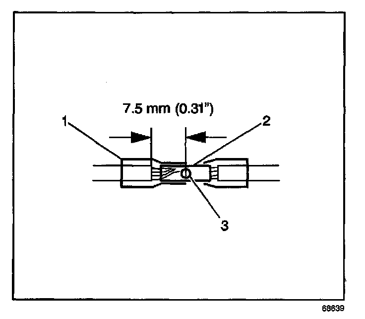 6. Place the splice sleeve in the nest. Ensure that the crimp falls midway between the end of the barrel and the stop. The sleeve has a stop (3) in the middle of the barrel (2) in order to prevent the wire (1) from going further. Close the hand crimper handles slightly in order to firmly hold the splice sleeve in the proper nest.