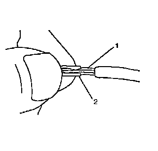 7. Center the splice clip (2) over the stripped wires (1) and hold the clip in place.