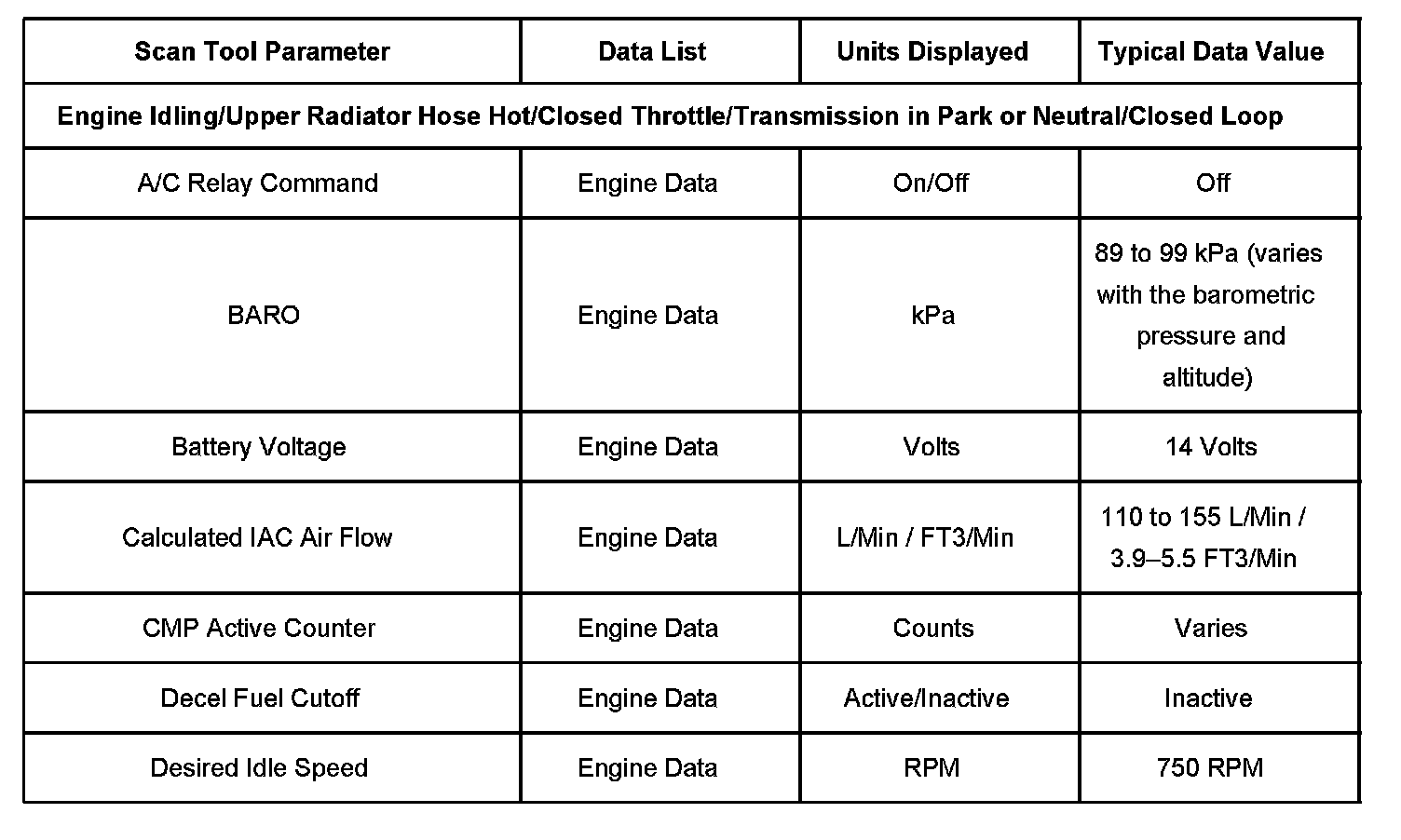The scan tool values from a correctly operating engine may be used for comparison with the engine you are diagnosing. The values listed in the following table represent typical values that would be seen on a good running engine.