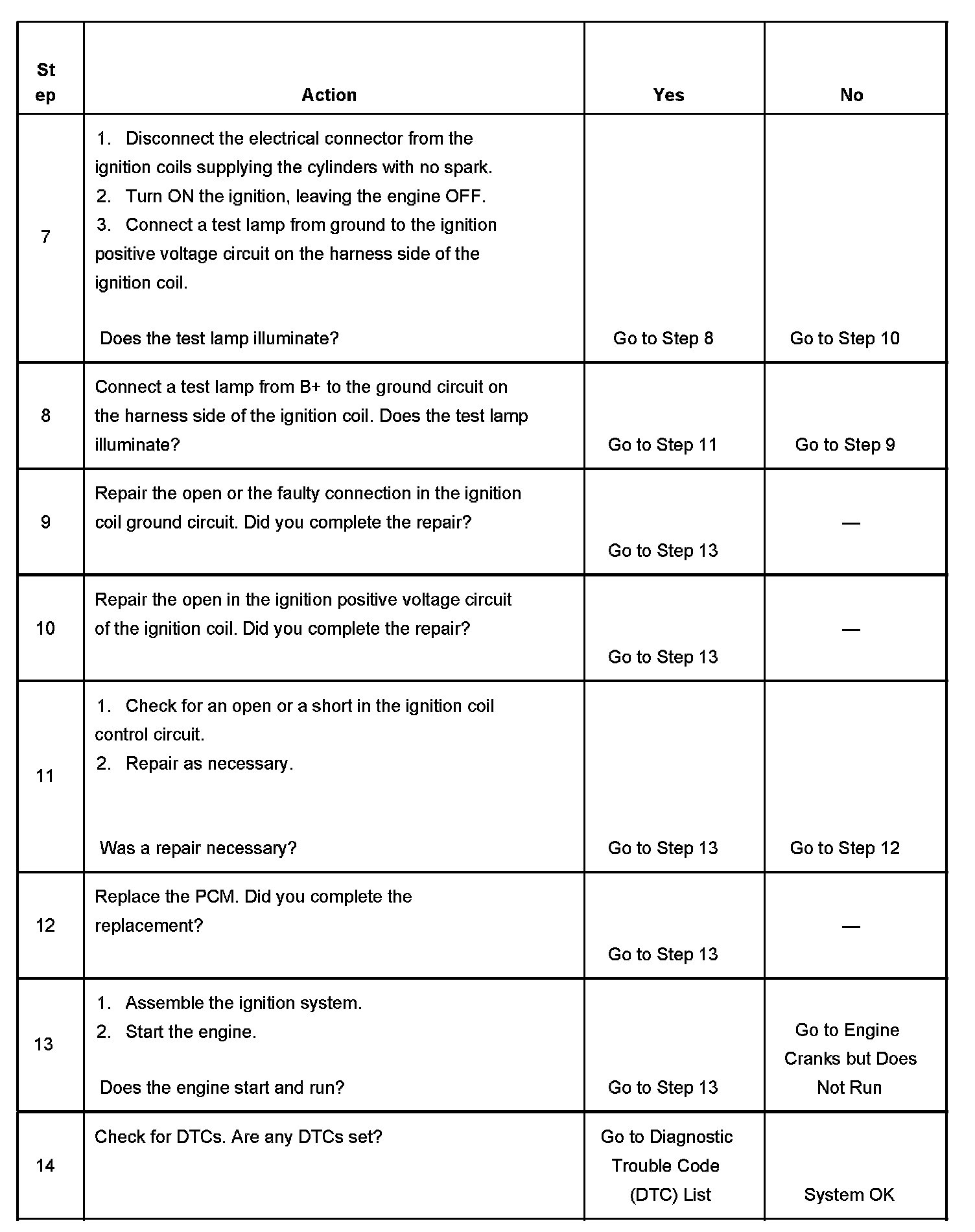 13. This step checks whether the engine will start and run. A repair that has been performed leading to this step may only have been a contributing cause of a no start condition. Returning to the Engine Cranks But Does Not Run diagnostic table will locate additional causes of the no start condition.