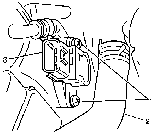 4. Install the two fasteners (1) securing the TP sensor (3) to the throttle body.