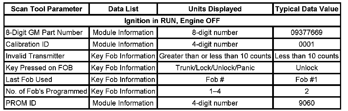 SCAN TOOL DATA LISTThe Keyless Entry Scan Tool Data List contains all of the keyless entry related parameters that are available on the scan tool. The parameters in the list are arranged in alphabetical order. The column, Data List, indicates the location of the parameter within the scan tool menu selections. Use the Keyless Entry Scan Tool Data List as directed by a diagnostic table or in order to supplement the diagnostic procedures. Begin all of the diagnostic procedures with Diagnostic System Check - Remote Keyless Entry. Use the Scan Tool Data List only after the following is determined: