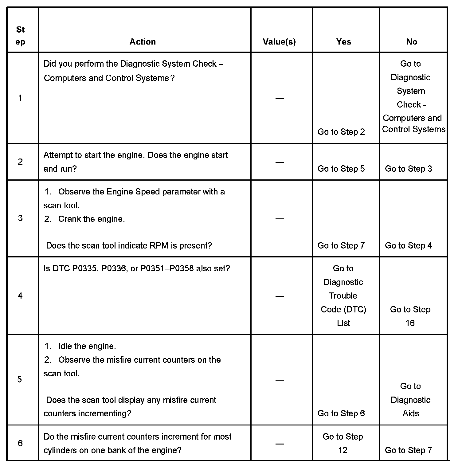The numbers below refer to the step numbers on the diagnostic table.
