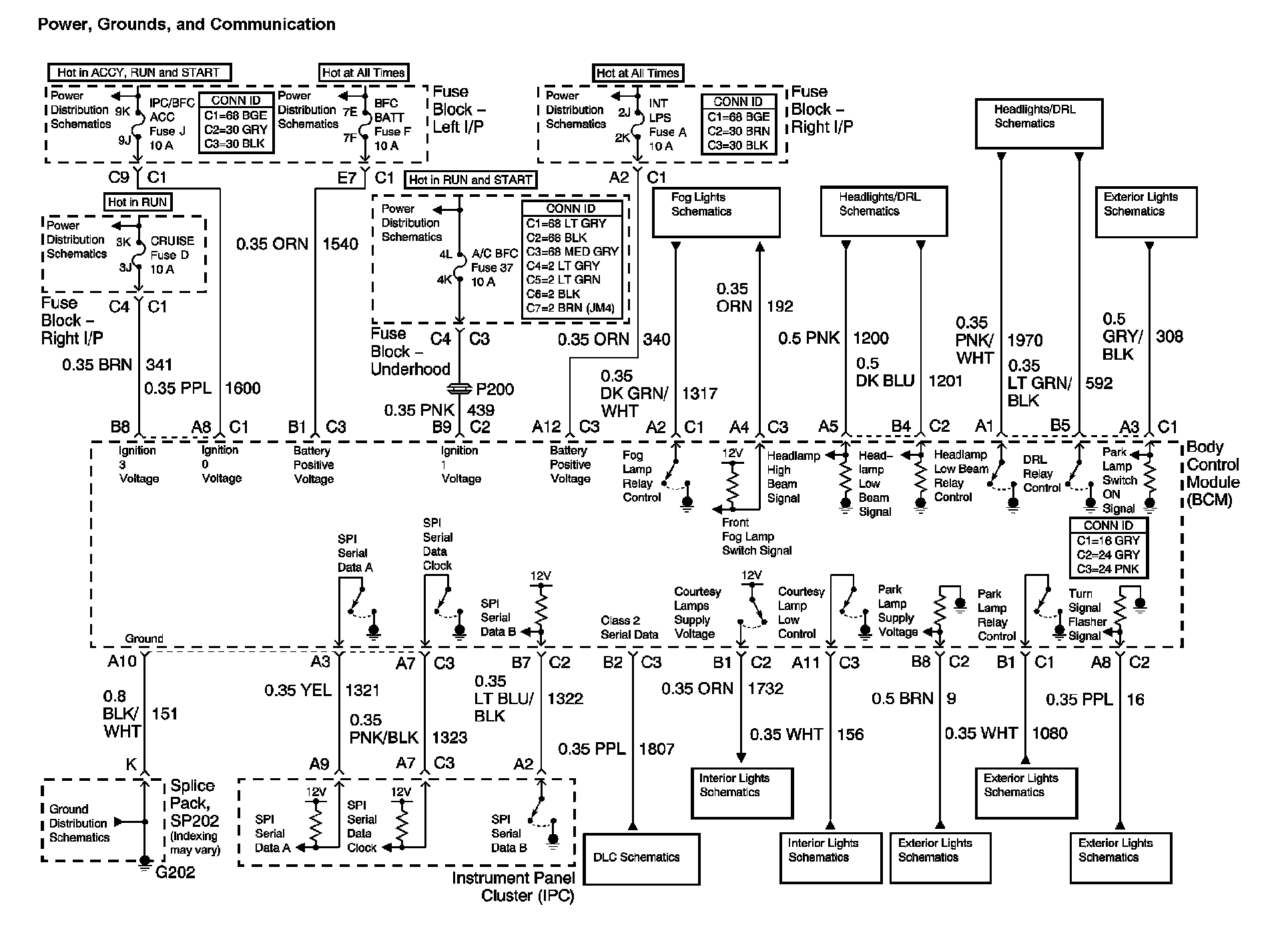 The locations for the Connectors, Grounds, Splices, and grommets shown within these diagrams can be found via their numbers at vehicle locations.