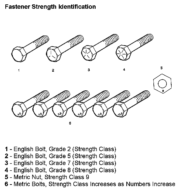 The most commonly used metric fastener strength property classes are 9.8 and 10.9. The class identification is embossed on the head of each bolt. The English, inch strength classes range from grade 2 to grade 8. Radial lines are embossed on the head of each bolt in order to identify the strength class. The number of lines on the head of the bolt is 2 lines less than the actual grade. For example, a grade 8 bolt will have 6 radial lines on the bolt head. Some metric nuts are marked with a single digit strength identification number on the nut face.
