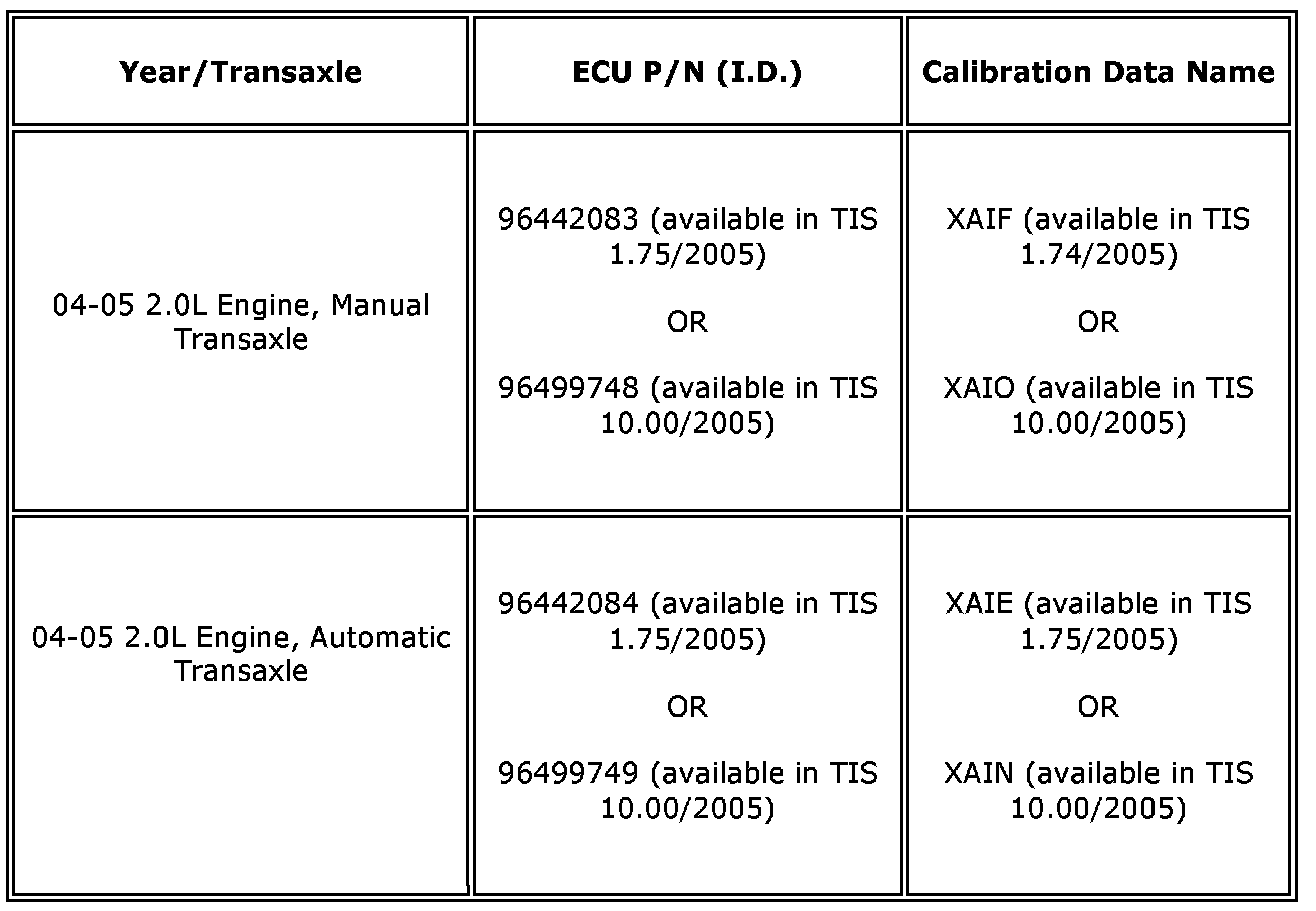 The service software and calibration is included in TIS data version 1.75 broadcast to dealers via GM Access on January 27, 2005 and on TIS 2000 CD-ROM version 02 2005 available February 2005 for North American dealers. All other regions can find these calibrations on TIS 2000 CD-ROM version 07.