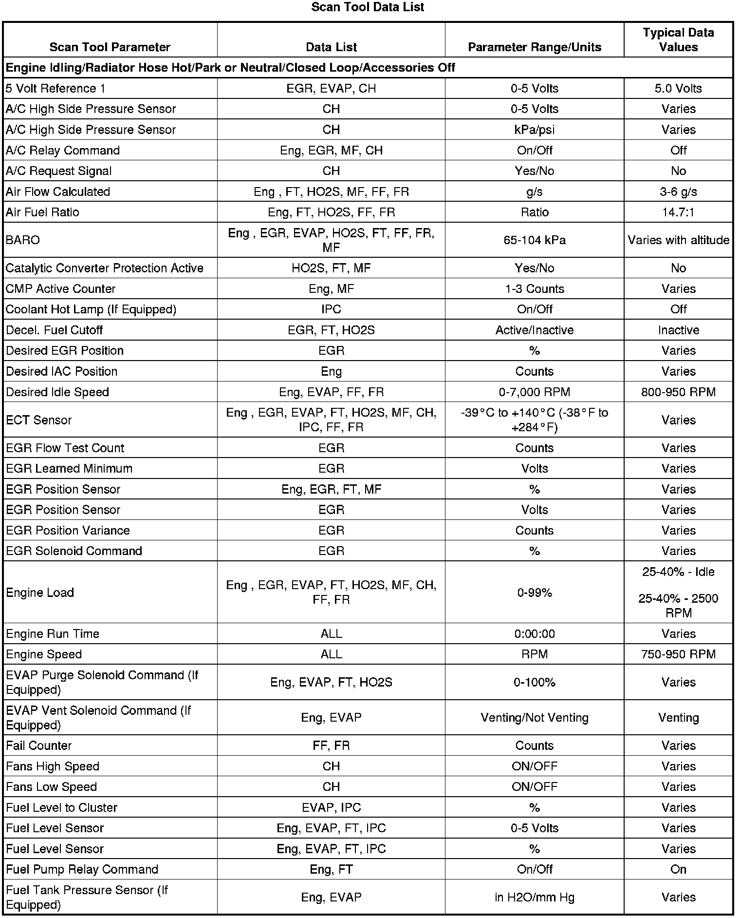 The Engine Scan Tool Data List contains all engine related parameters that are available on the scan tool. The list is arranged in alphabetical order. A parameter may appear in any one of the data lists, and in some cases may appear more than once, or in more than one data list in order to group certain related parameters together.