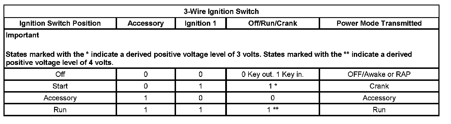 On vehicles that have several control modules connected by serial data circuits, one module is the power mode master (PMM). On this vehicle, the PMM is the body control module (BCM). The PMM receives 3 discrete ignition switch signals to differentiate which power mode will be sent over the Serial Data circuits. The 3-wire Ignition Switch table illustrates the state of these inputs in correspondence to the ignition switch position:
