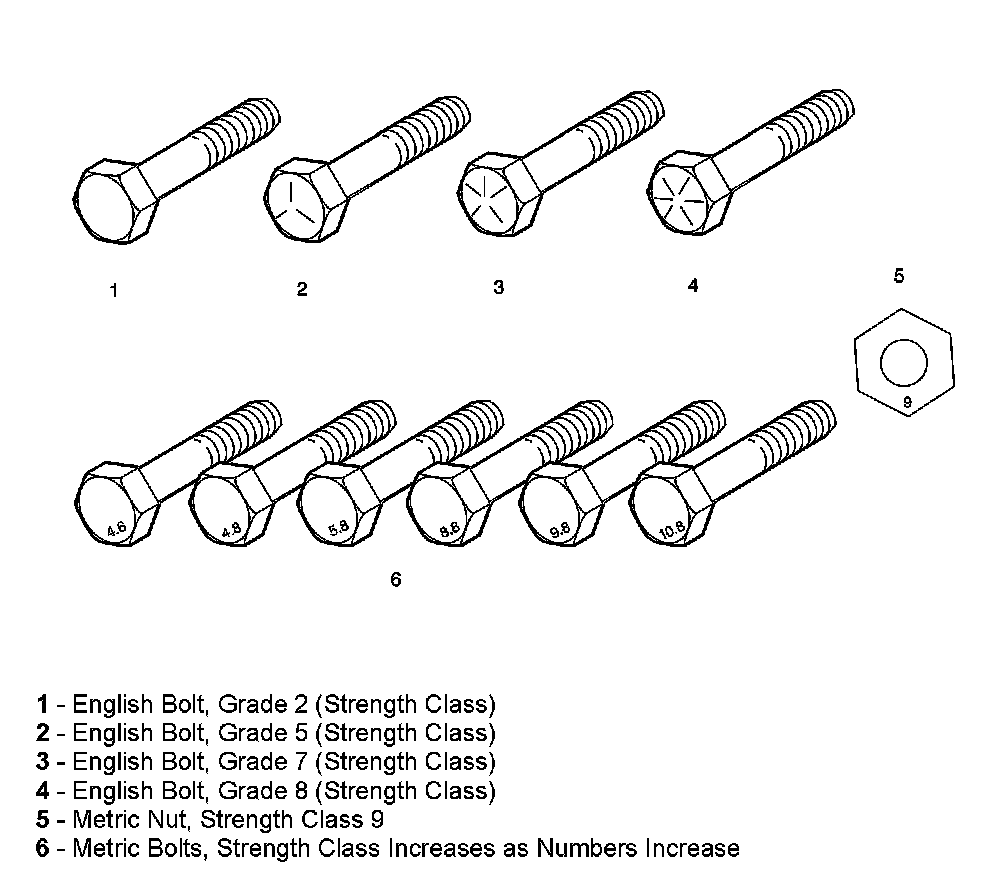 The most commonly used metric fastener strength property classes are 9.8 and 10.9. The class identification is embossed on the head of each bolt. The English, inch strength classes range from grade 2 to grade 8. Radial lines are embossed on the head of each bolt in order to identify the strength class. The number of lines on the head of the bolt is 2 lines less than the actual grade. For example, a grade 8 bolt will have 6 radial lines on the bolt head. Some metric nuts are marked with a single digit strength identification number on the nut face.