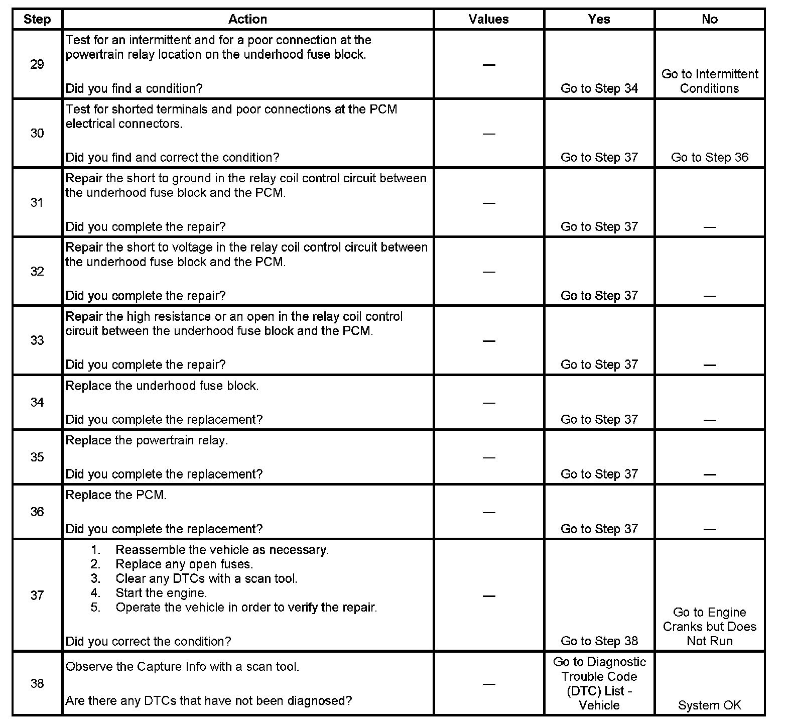 If the powertrain relay fails to close, the engine will crank but will not run. The class 2 communications will be available with the use of a scan tool.