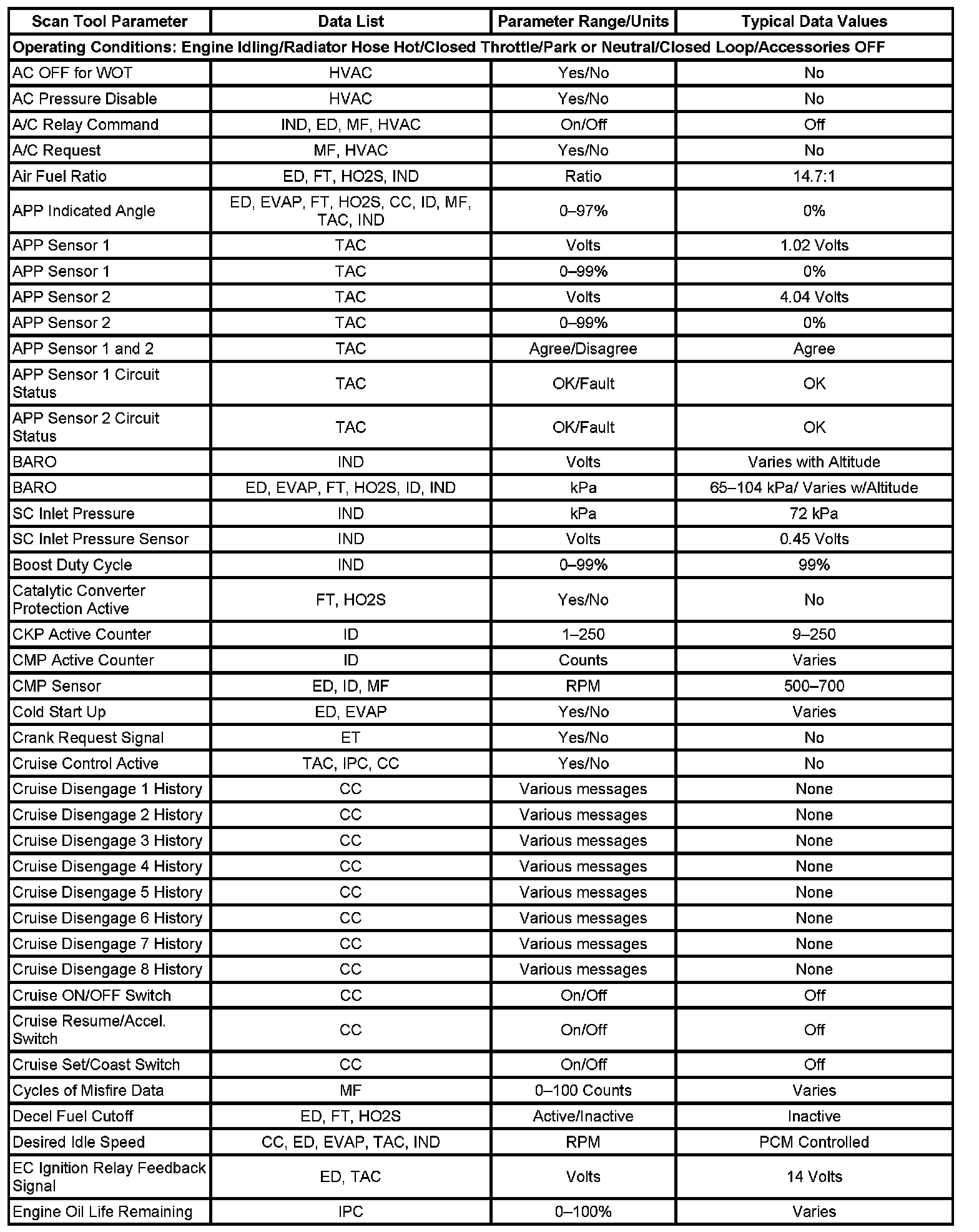 The Engine Scan Tool Data List contains all engine related parameters that are available on the scan tool. The list is arranged in alphabetical order. A given parameter may appear in any one of the data lists, and in some cases may appear more than once, or in more than one data list in order to group certain related parameters together.
