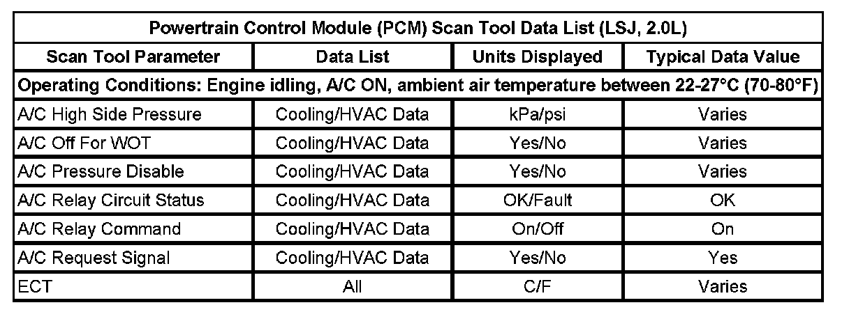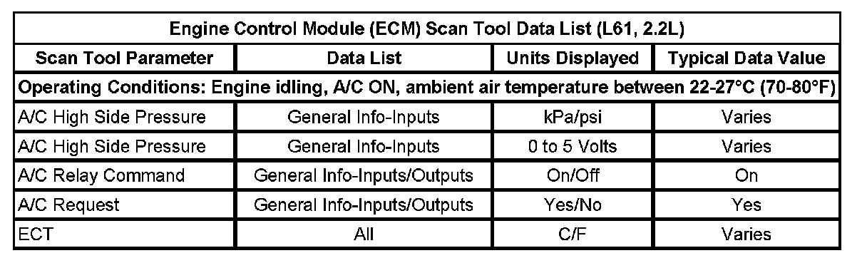 The scan tool data values were taken from a known good vehicle under the following conditions: