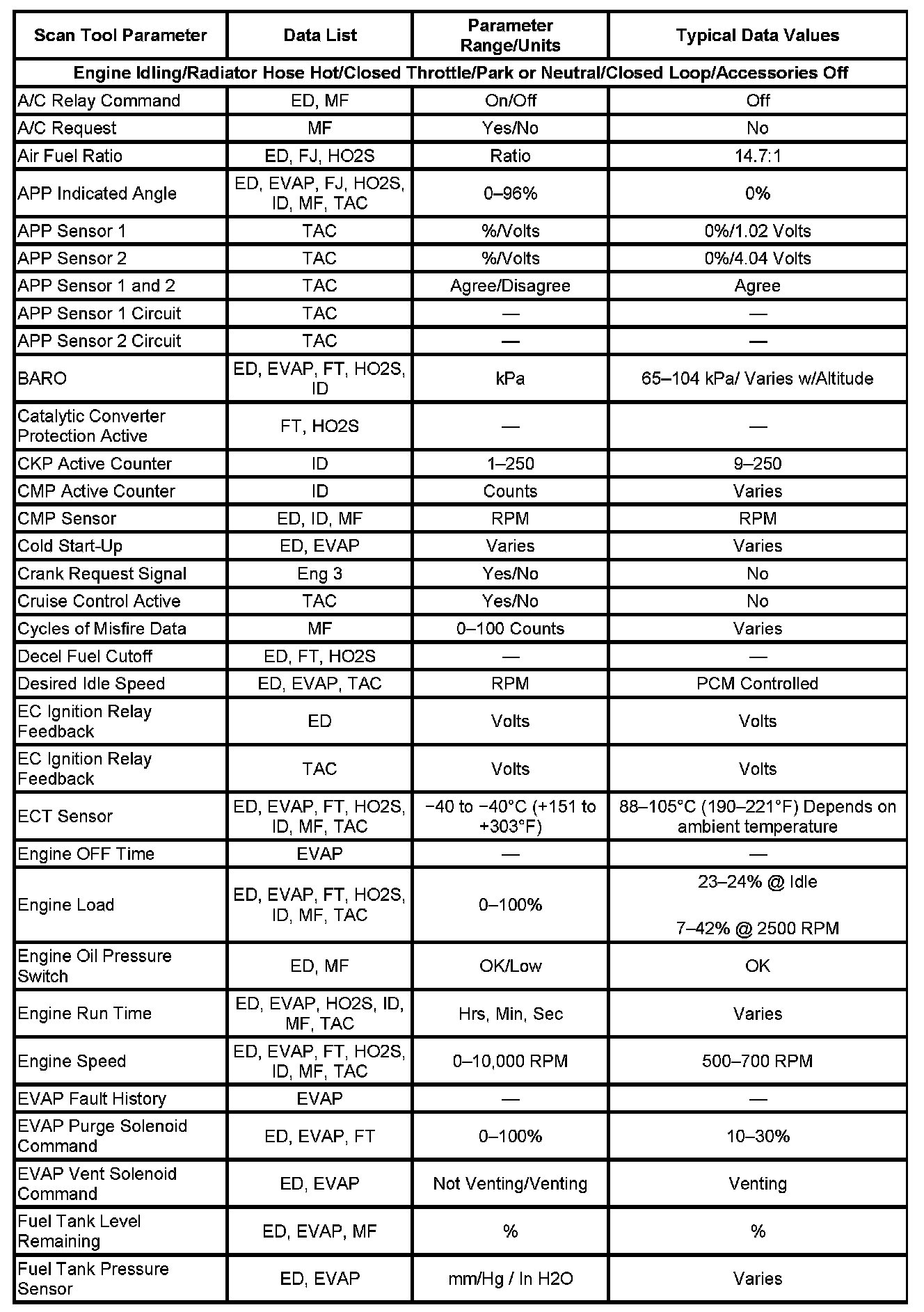 The Engine Scan Tool Data List contains all engine related parameters that are available on the scan tool. The list is arranged in alphabetical order. A given parameter may appear in any one of the data lists, and in some cases may appear more than once, or in more than one data list in order to group certain related parameters together.