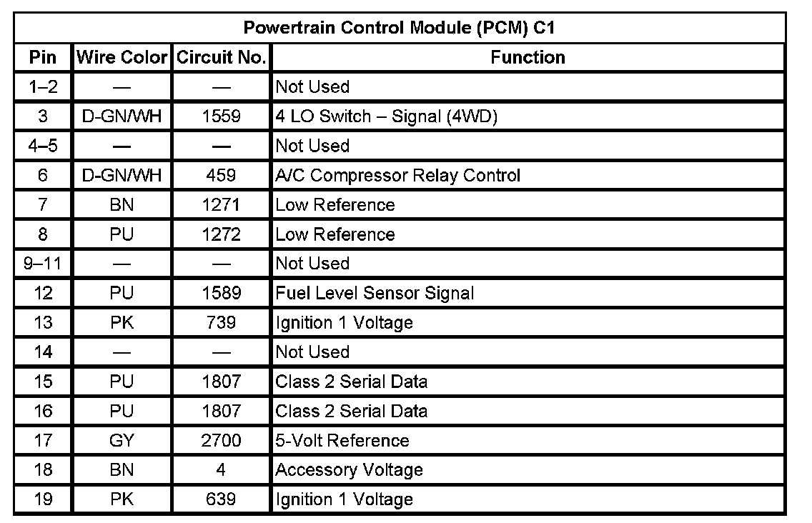 Powertrain Control Module (PCM) C1 (Pin 1 To 19):