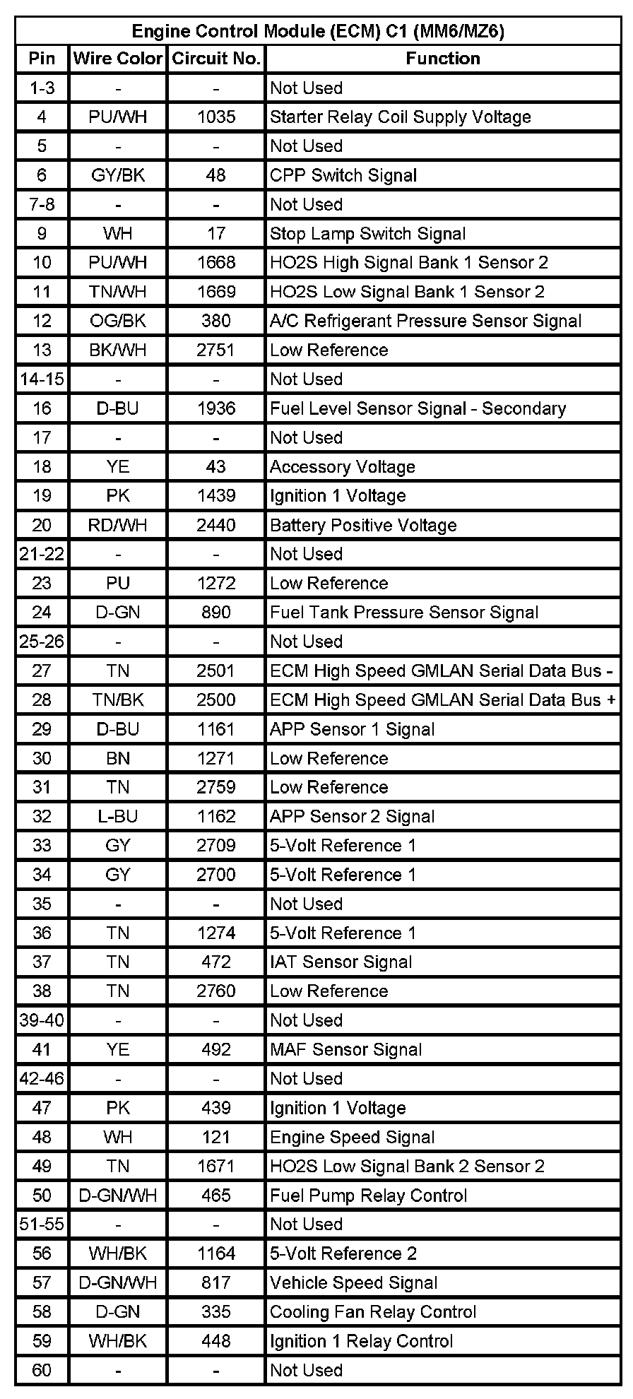 Engine Control Module (ECM) C1 (MM6/MZ6) (Pin 1 To 60):