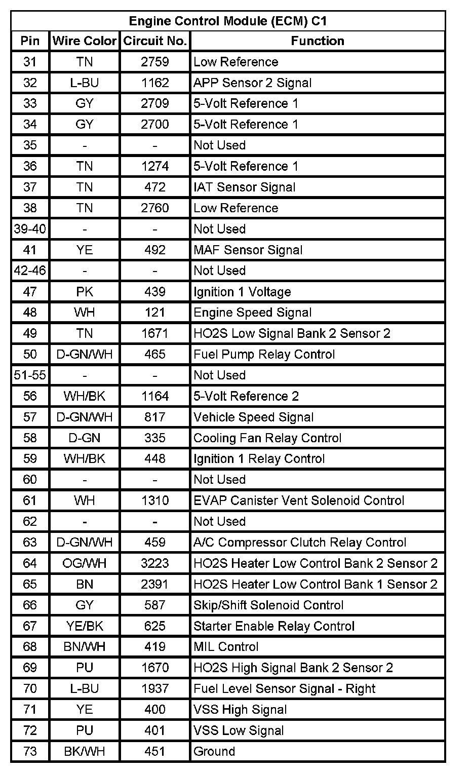 Engine Control Module (ECM) C1 (Pin 31 To 73):