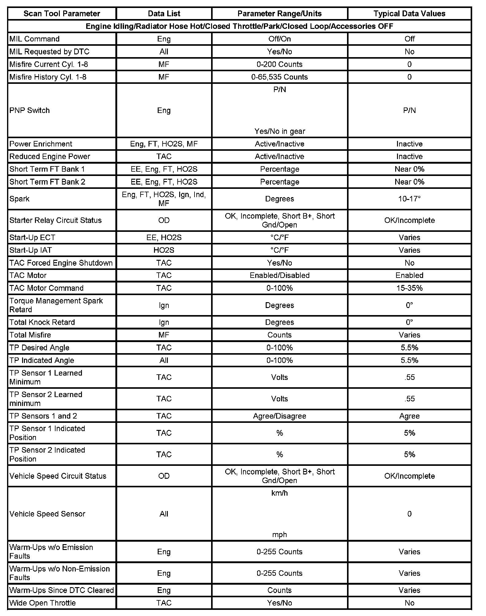 Scan tool values from a properly running engine may be used for comparison with the engine you are diagnosing. The Engine Scan Tool Data List represents values that would be seen on a normal running engine.