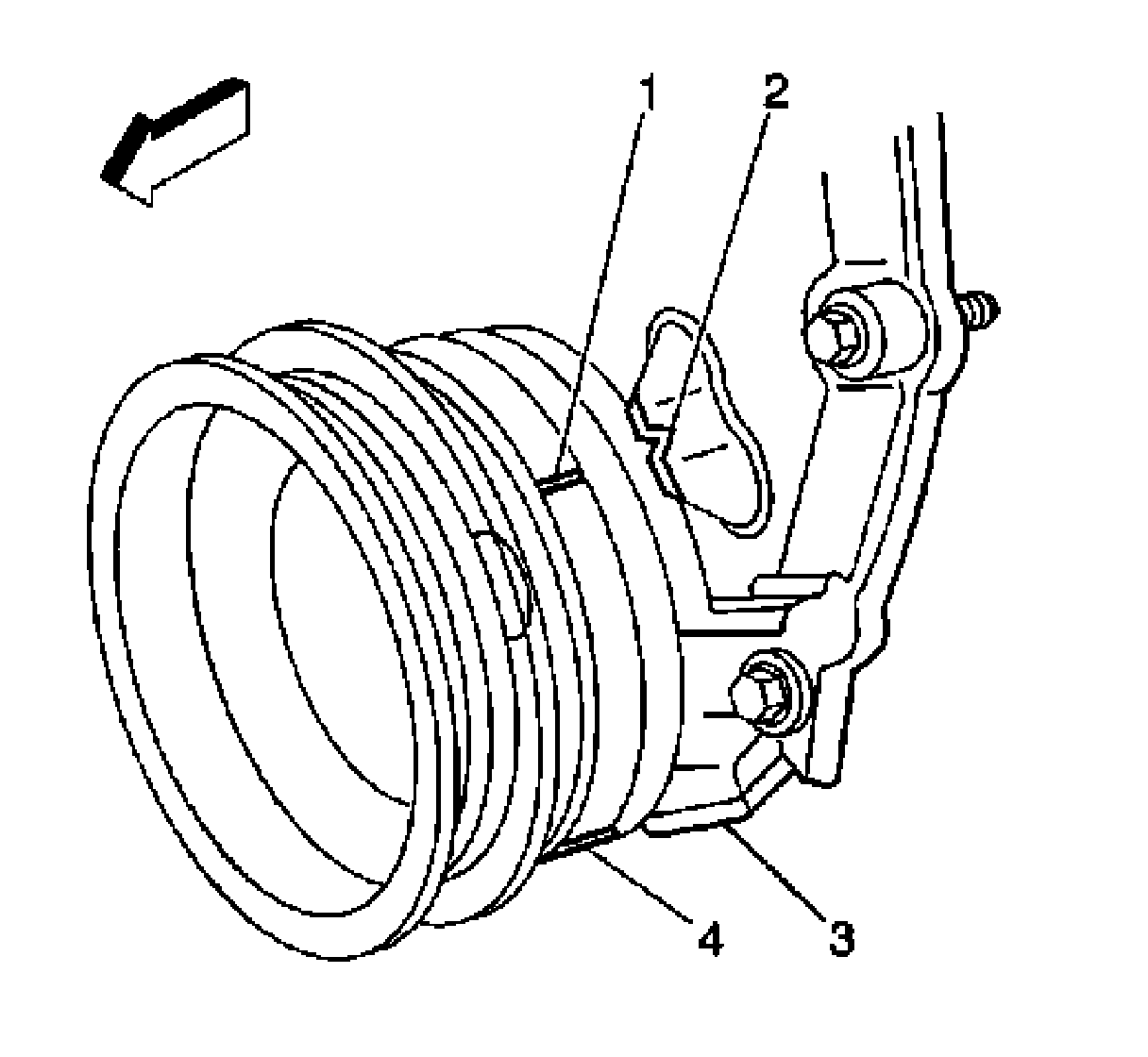 Important: Rotate the number 1 cylinder to top dead center (TDC) of the compression stroke. The engine front cover has 2 alignment tabs and the crankshaft balancer has 2 alignment marks spaced 90 degrees apart which are used for positioning the number 1 piston at TDC. With the piston on the compression stroke and at TDC, the crankshaft balancer alignment mark (1) must align with the engine front cover tab (2) and the crankshaft balancer alignment mark (4) must align with the engine front cover tab (3).