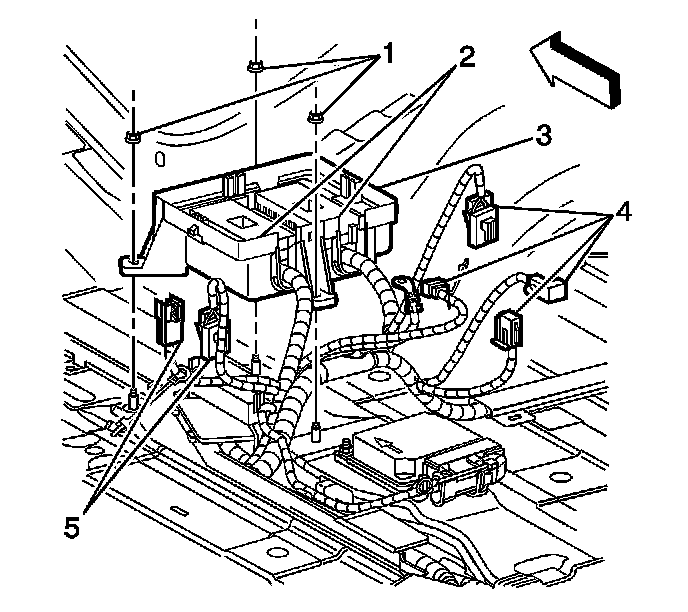 2. Install the junction block base (3) to the floor studs.Ensure the remaining electrical connections (4, 5) are not captured under the junction block base after installations the floor studs.