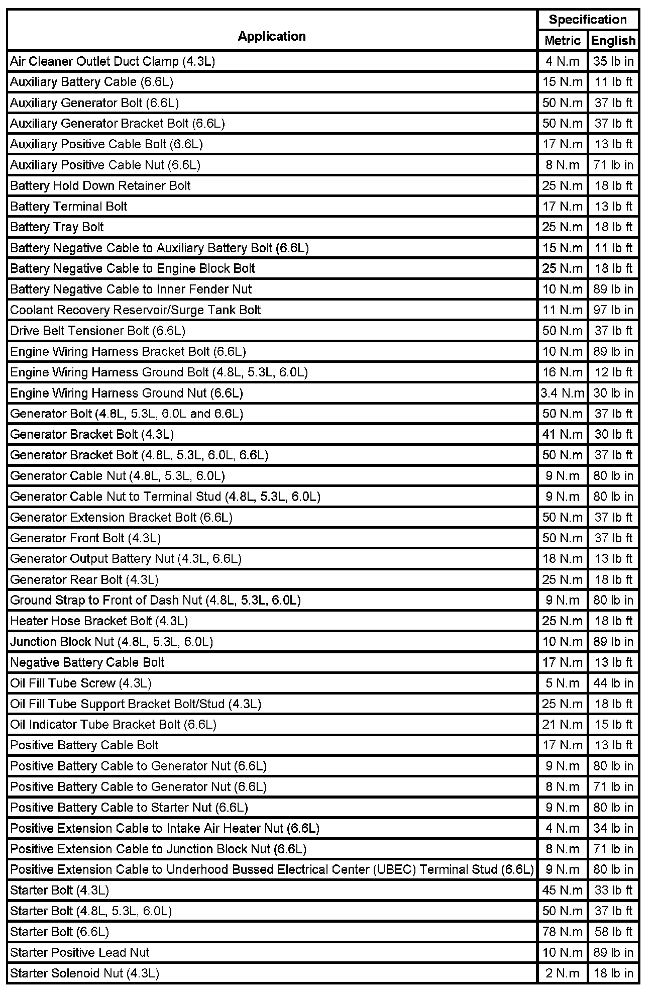 Starting and Charging: Specifications