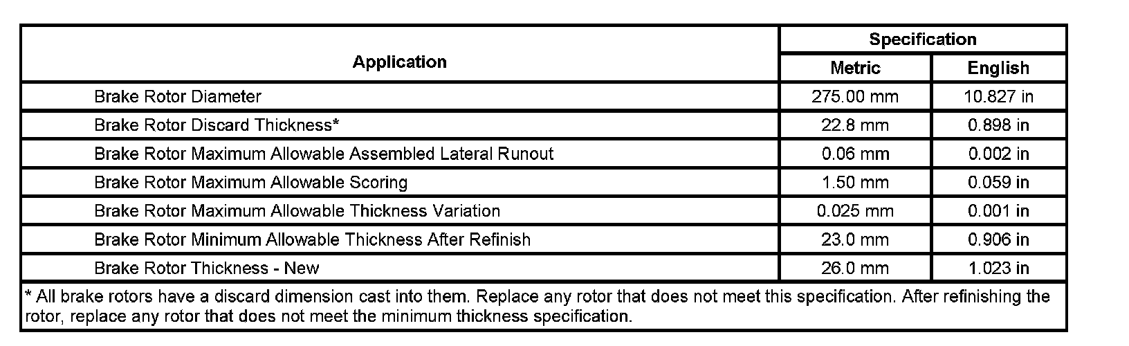 Disc Brake Component Specifications: