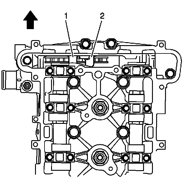 Lower the timing chain through the opening in the cylinder head. Use care to ensure that the chain goes around both sides of the cylinder block bosses (1, 2).