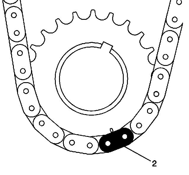 Route the timing chain around the crankshaft sprocket and line up the first matching colored link (2) with the timing mark on the crankshaft sprocket, in approximately the 5 o'clock position.