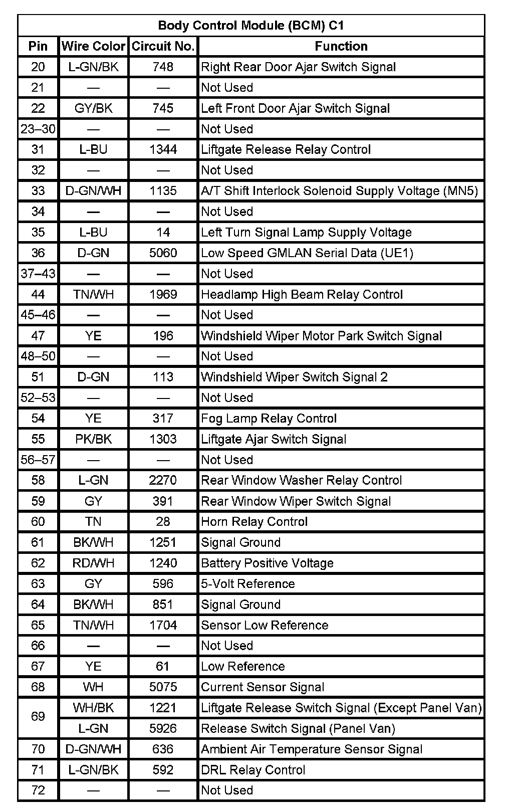 Body Control Module (BCM) C1 (Pin 20 To 72):