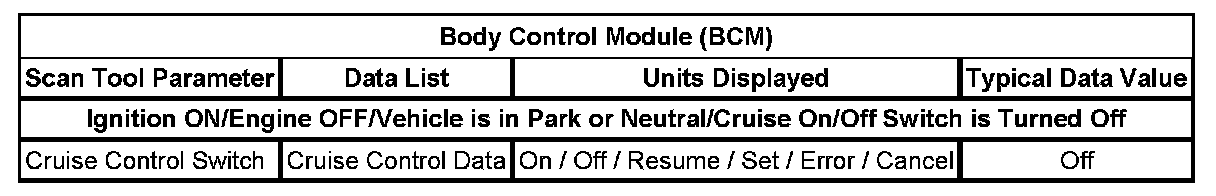 The scan tool data lists contain all of the cruise control related parameters that are available on the scan tool. The parameters in the list are arranged in alphabetical order. The data list column indicates the location of the parameter within the scan tool menu selections.