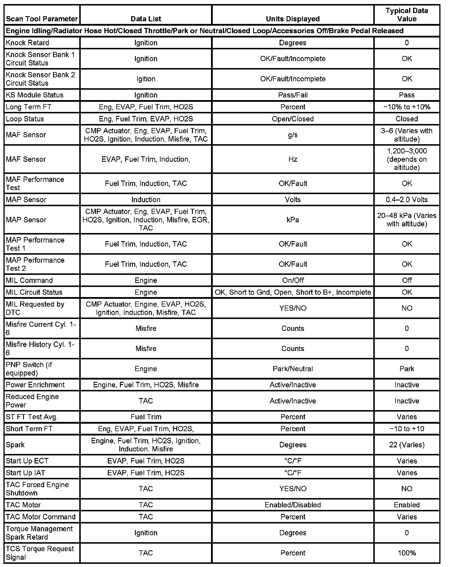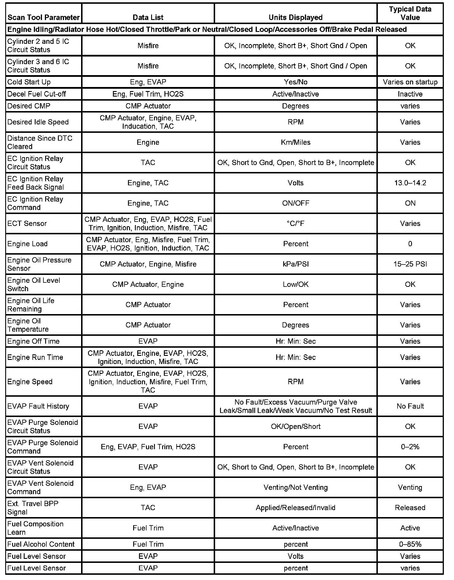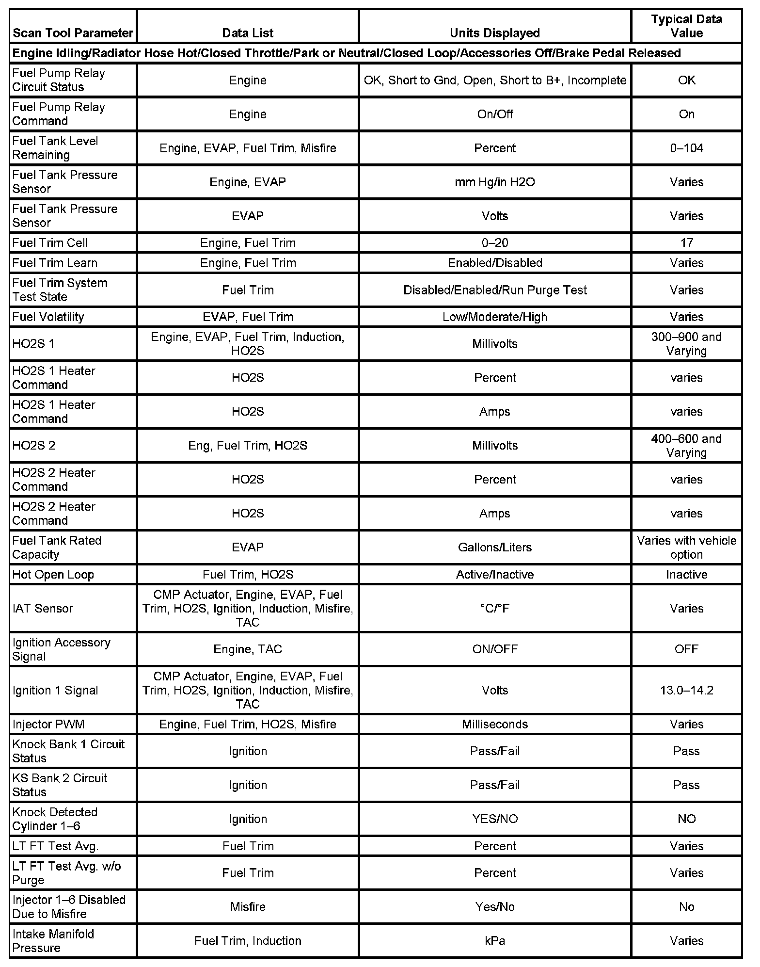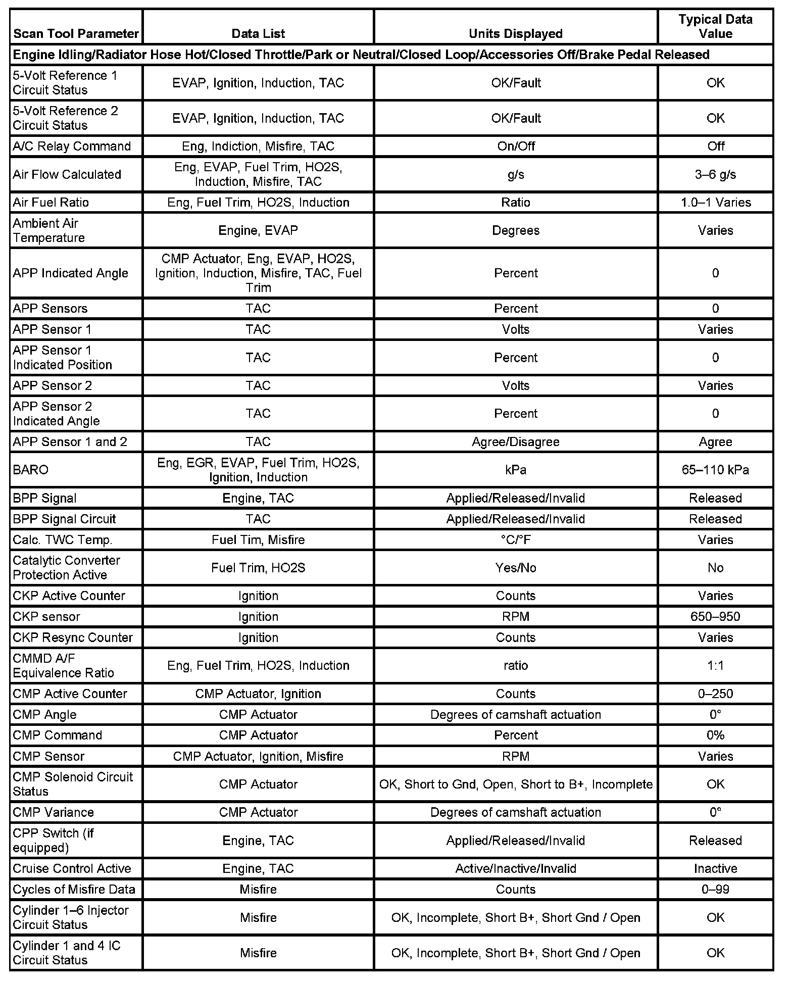 The Engine Scan Tool Data List contains all engine-related parameters that are available on the scan tool. The list is arranged in alphabetical order. A given parameter may appear in any one of the data lists, and in some cases may appear more than once, or in more than one data list in order to group certain related parameters together.