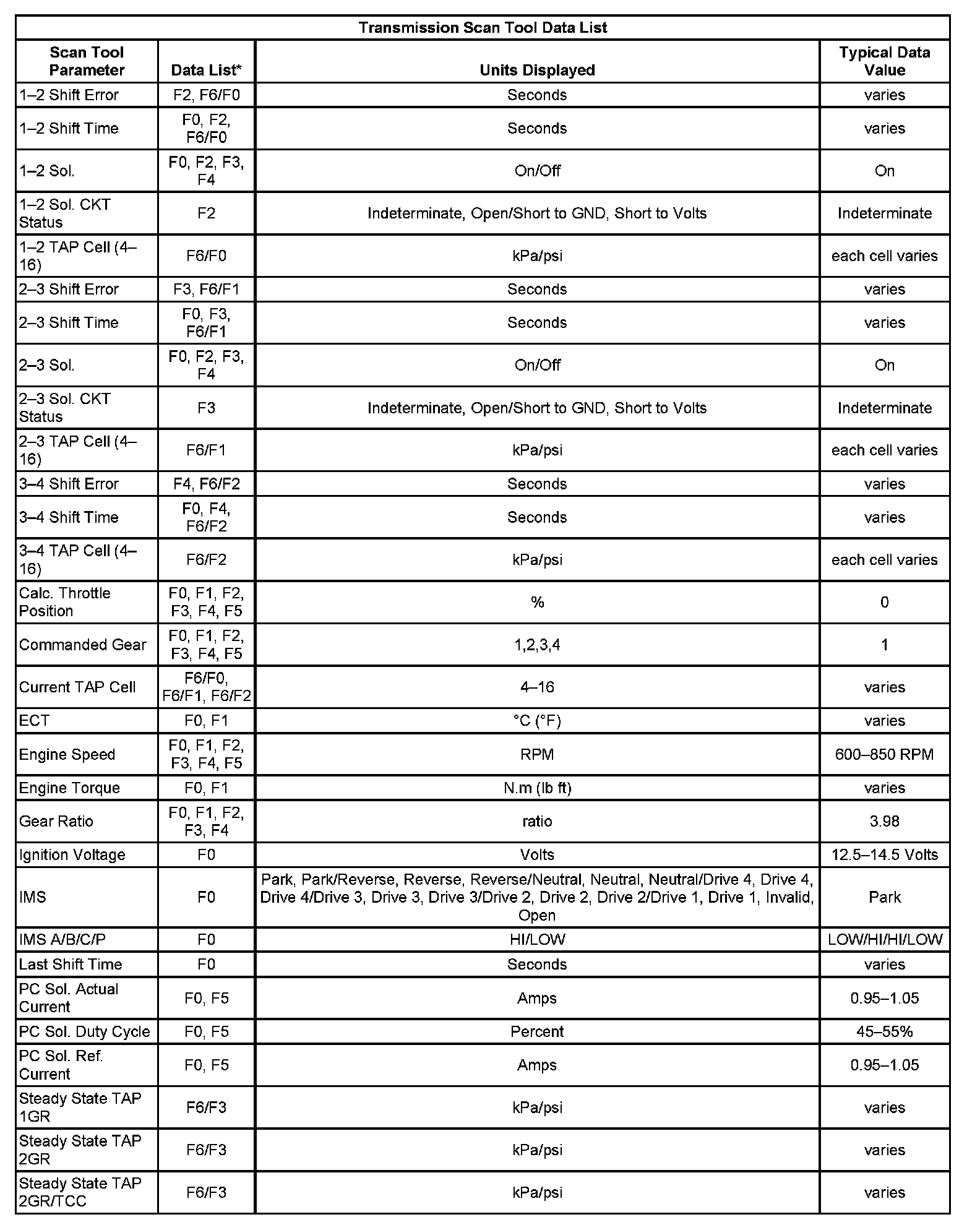 Transmission Scan Tool Data List: