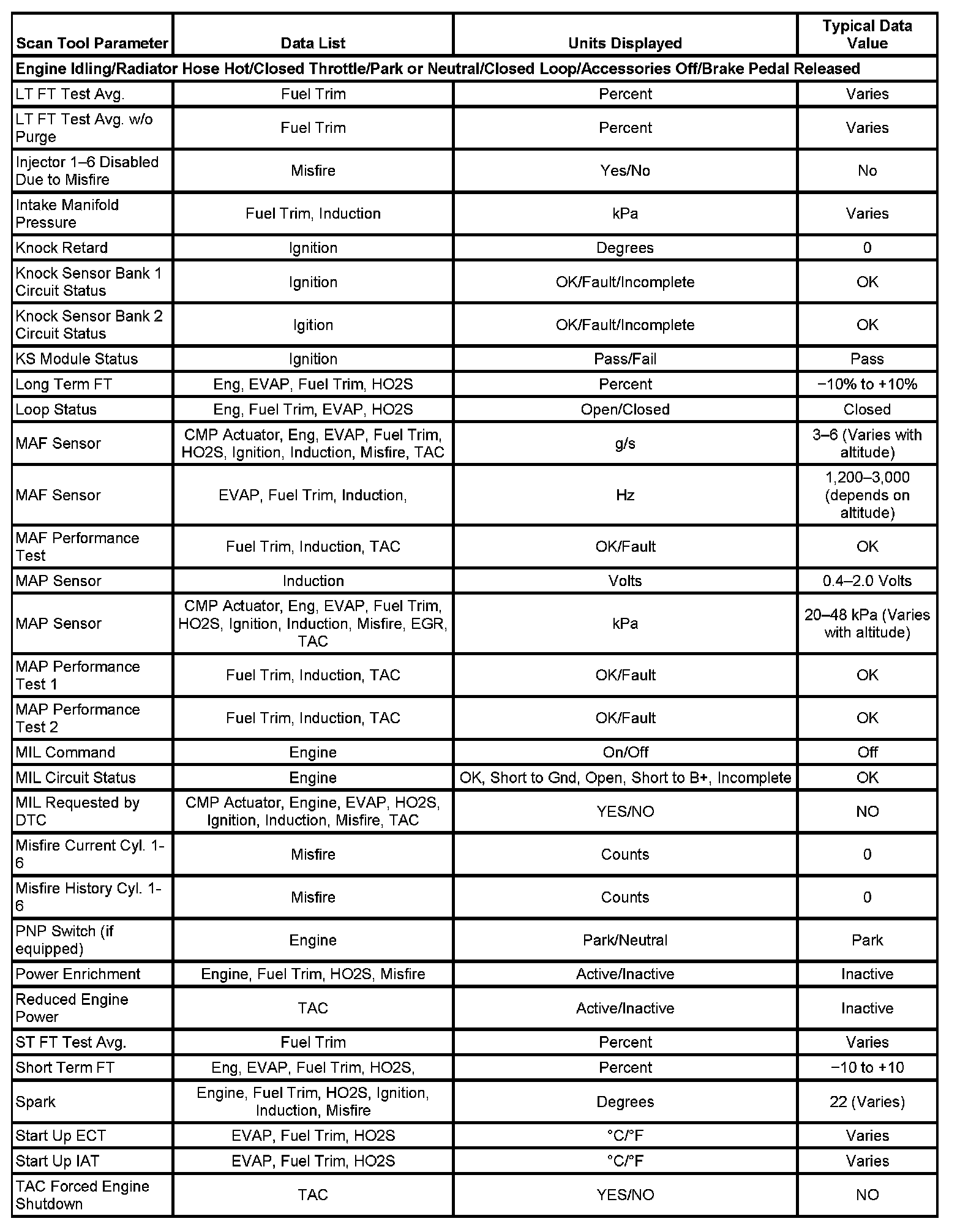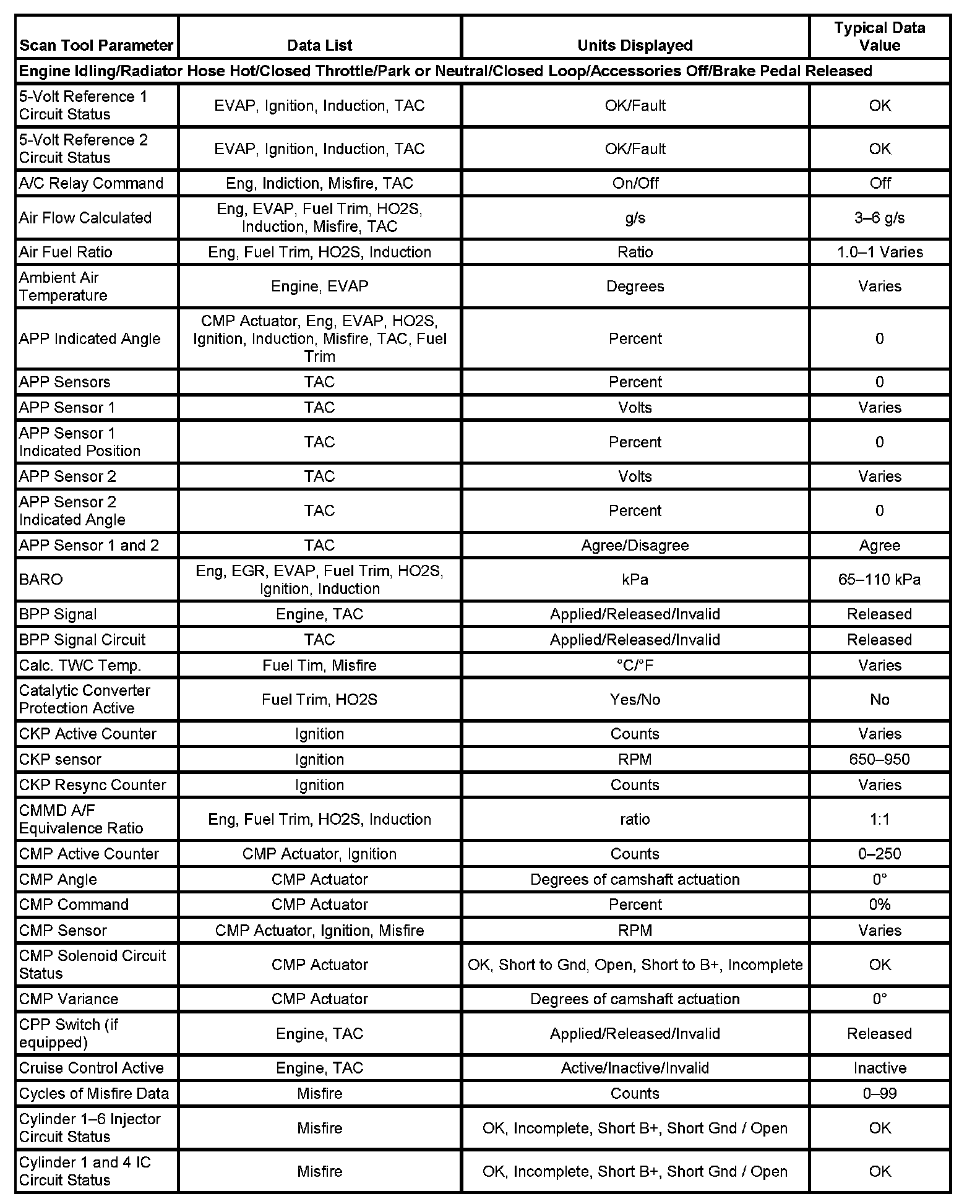 The Engine Scan Tool Data List contains all engine-related parameters that are available on the scan tool. The list is arranged in alphabetical order. A given parameter may appear in any one of the data lists, and in some cases may appear more than once, or in more than one data list in order to group certain related parameters together.