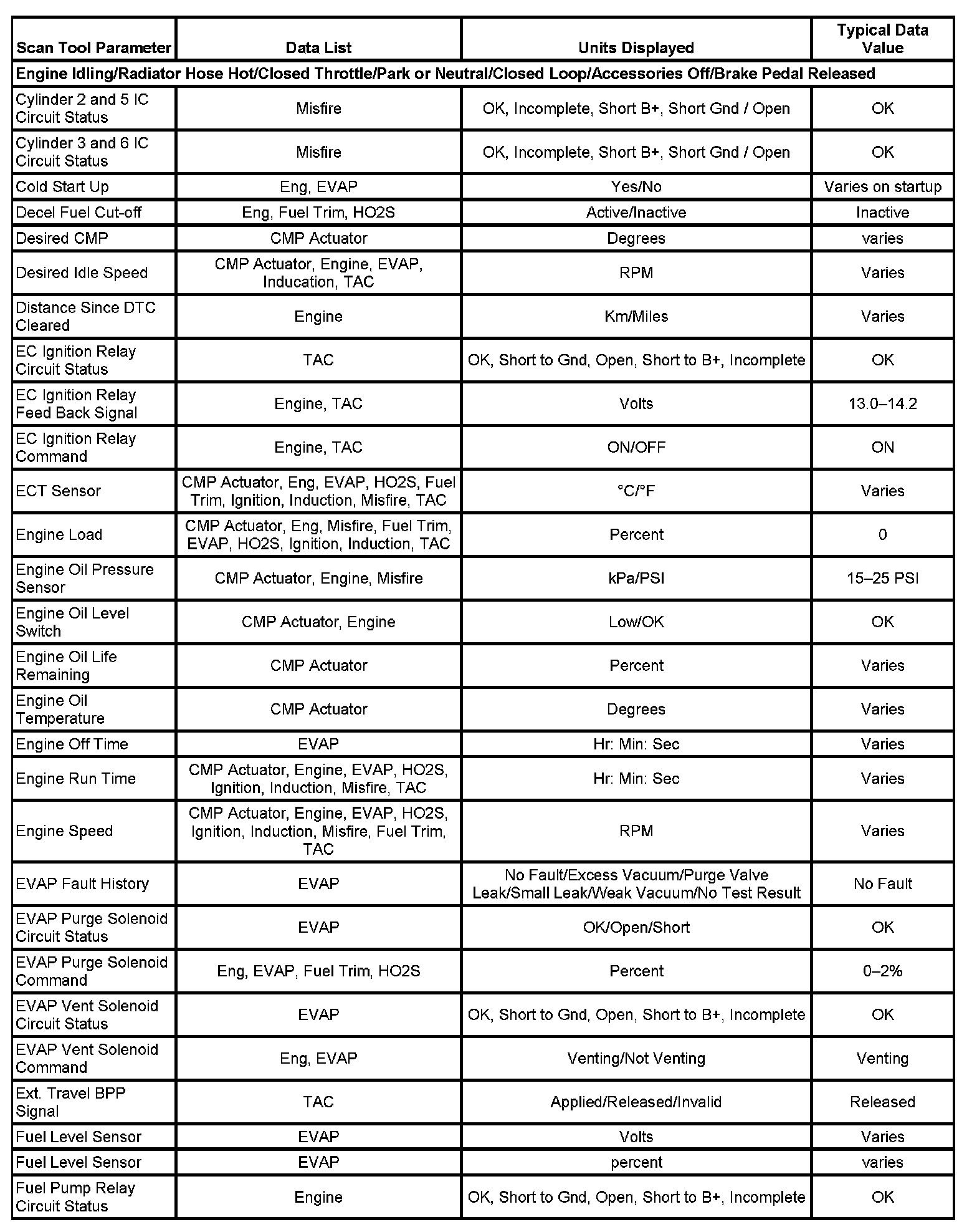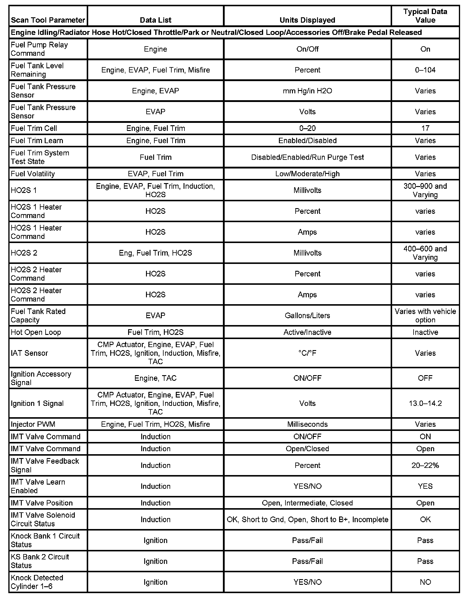 The scan tool values from a properly running engine may be used for comparison with the engine you are diagnosing. The Engine Scan Tool Data List represents values that would be seen on a normally running engine.