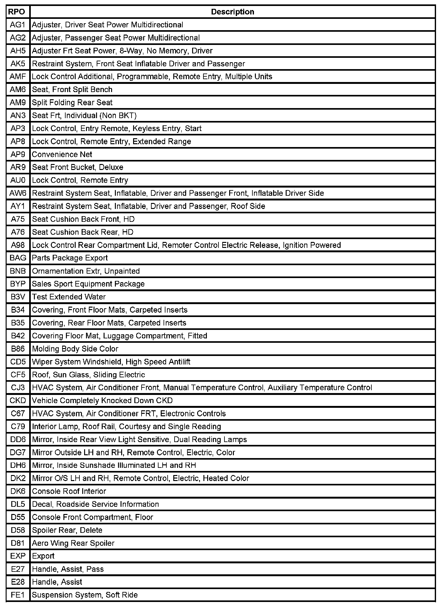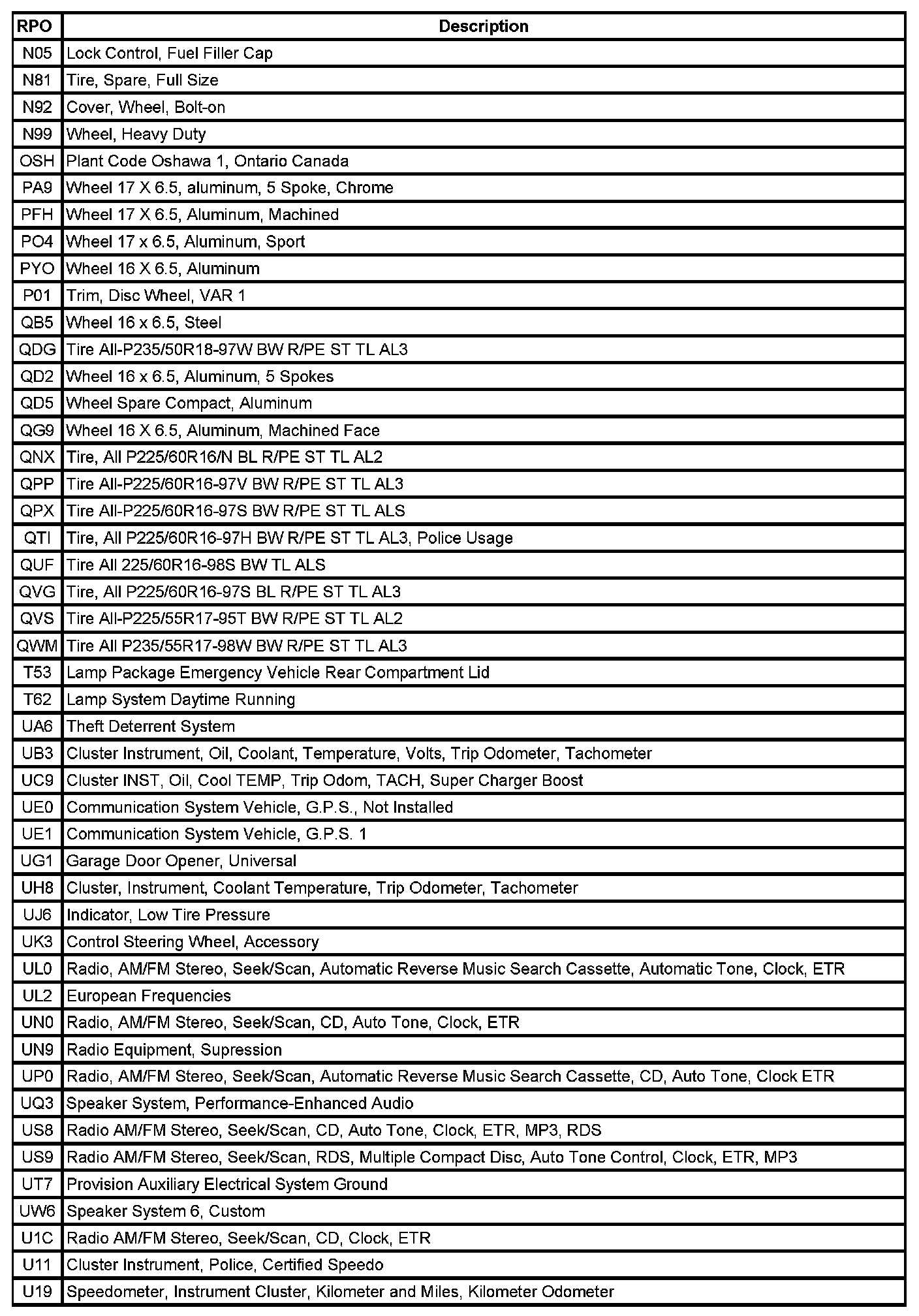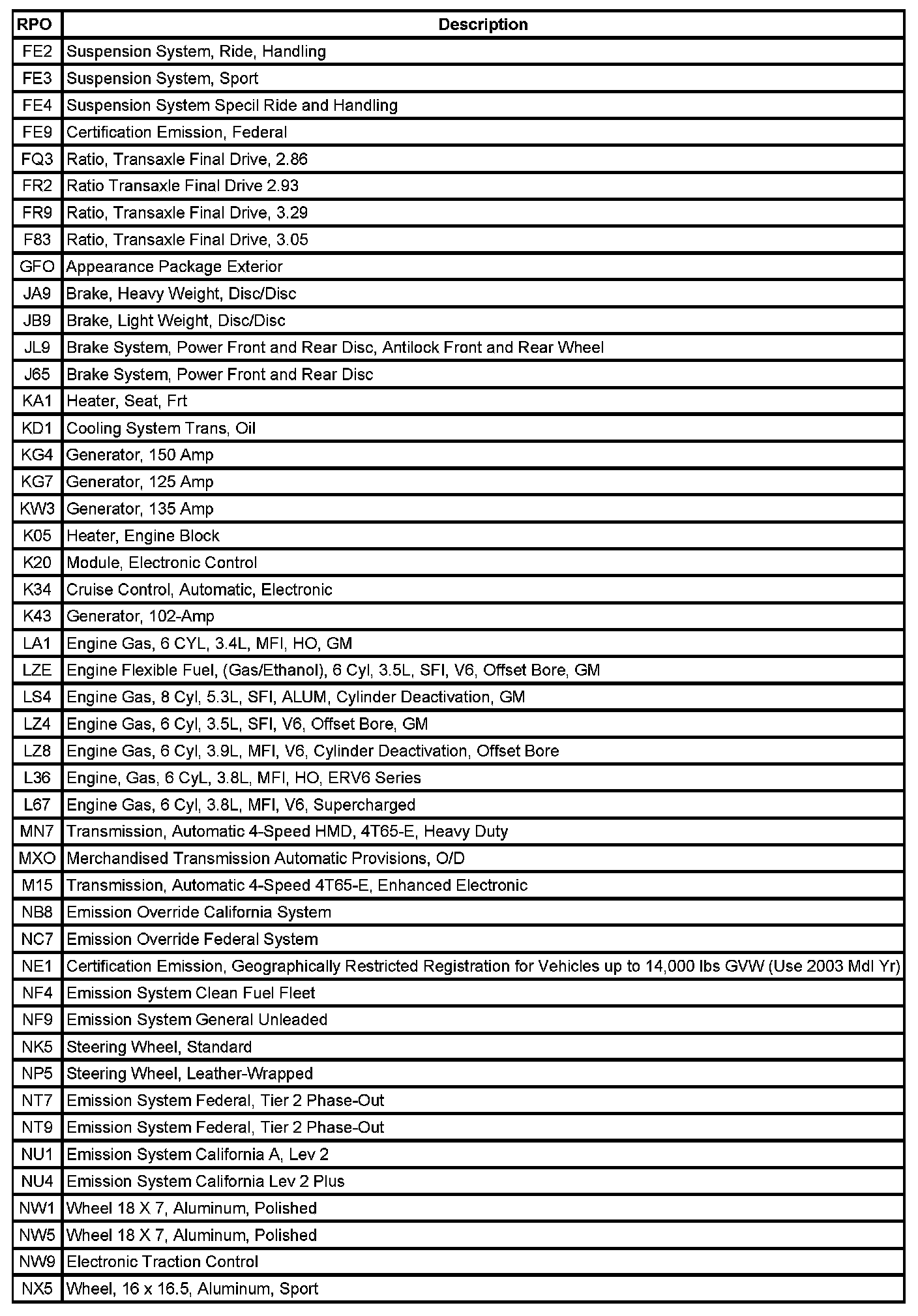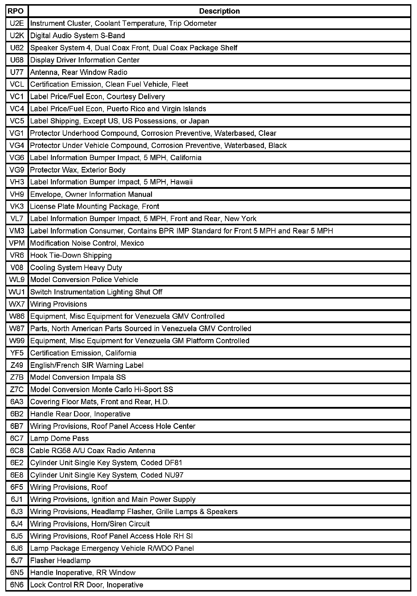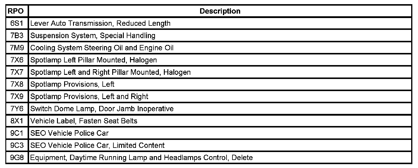 The following table provides the description of the Regular Production Option (RPO) codes that are available on the vehicle. The vehicle's RPO list is printed on the Service Parts Identification Label.
