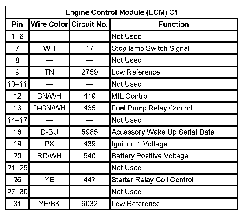 Engine Control Module (ECM) C1 (Pin 1 To 31):