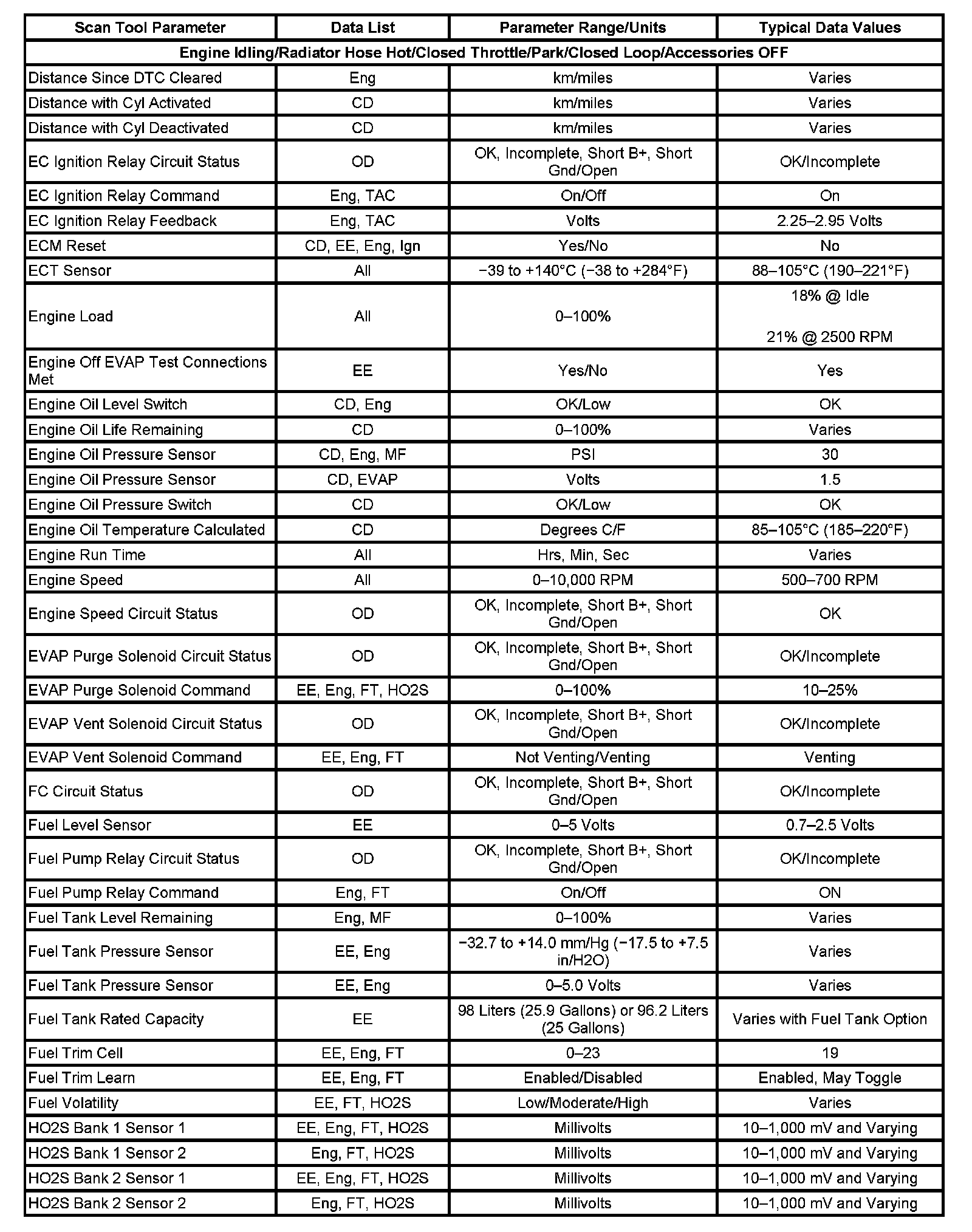 Scan tool values from a properly running engine may be used for comparison with the engine you are diagnosing. The Engine Scan Tool Data List represents values that would be seen on a normal running engine at idle.
