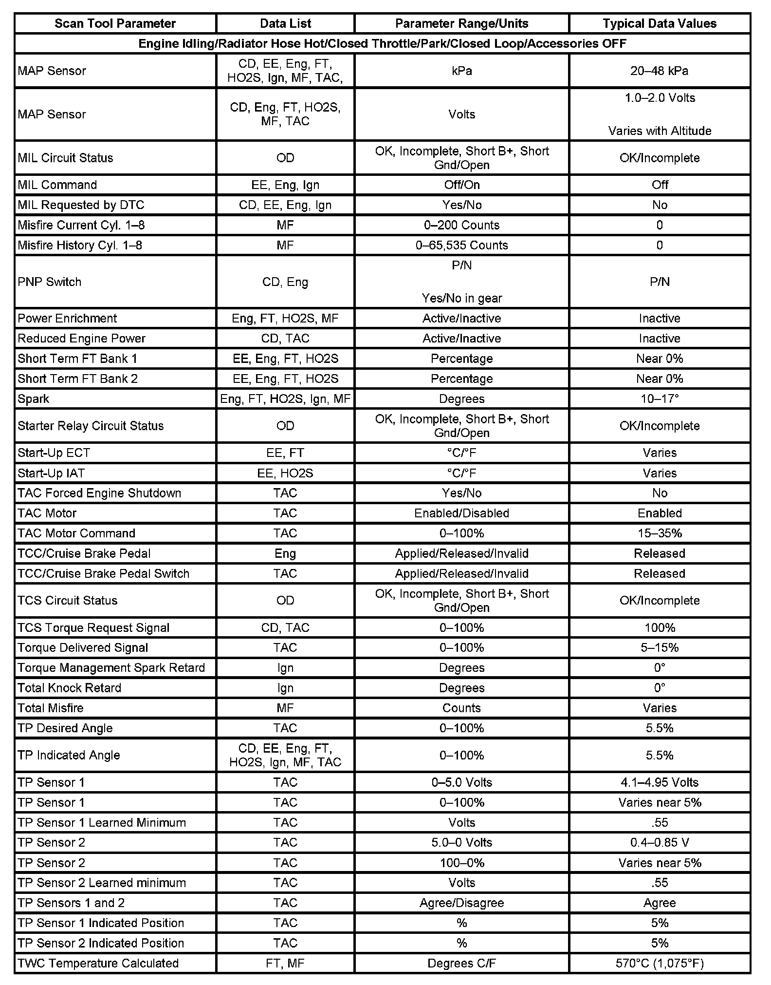 Only the parameters listed below are referenced in this service data for use in diagnosis. If all values are within the typical range described below, refer to Symptoms - Computers and Control Systems for diagnosis. - Symptoms - Engine Controls