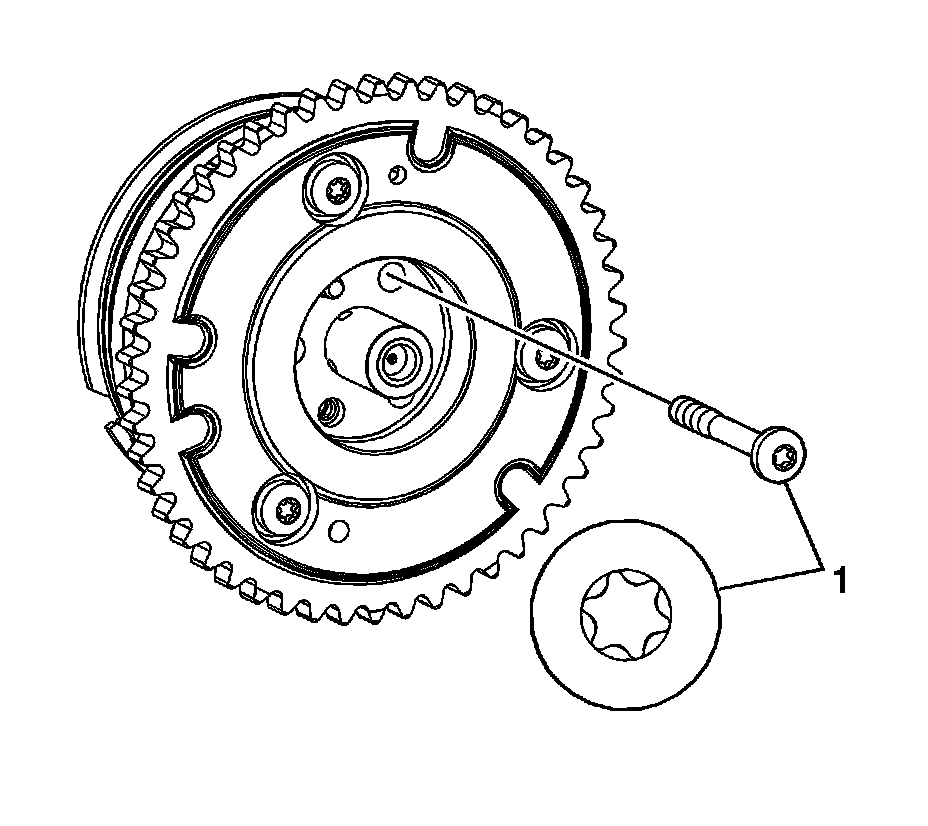 Notice: Use only a Torx Plus(R) Bit when removing or installing the camshaft position actuator fasteners (1). The Torx Plus(R) design differs from typical Torx(R) fastener. Use of a standard Torx(R) bit on Torx Plus(R) fasteners may result in a rounded out fastener head or incorrect faster torque.