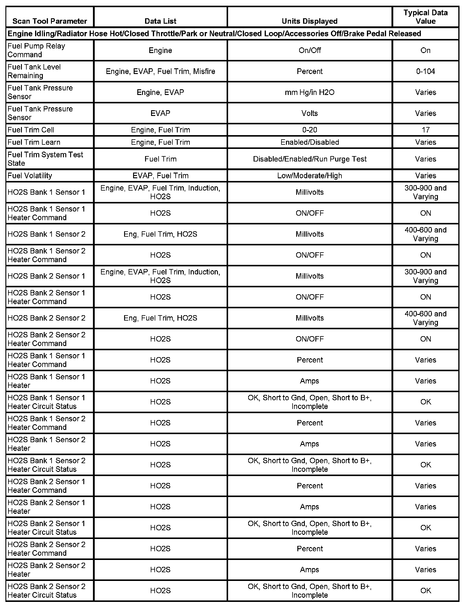 The scan tool values from a properly running engine may be used for comparison with the engine you are diagnosing. The Engine Scan Tool Data List represents values that would be seen on a normally running engine.