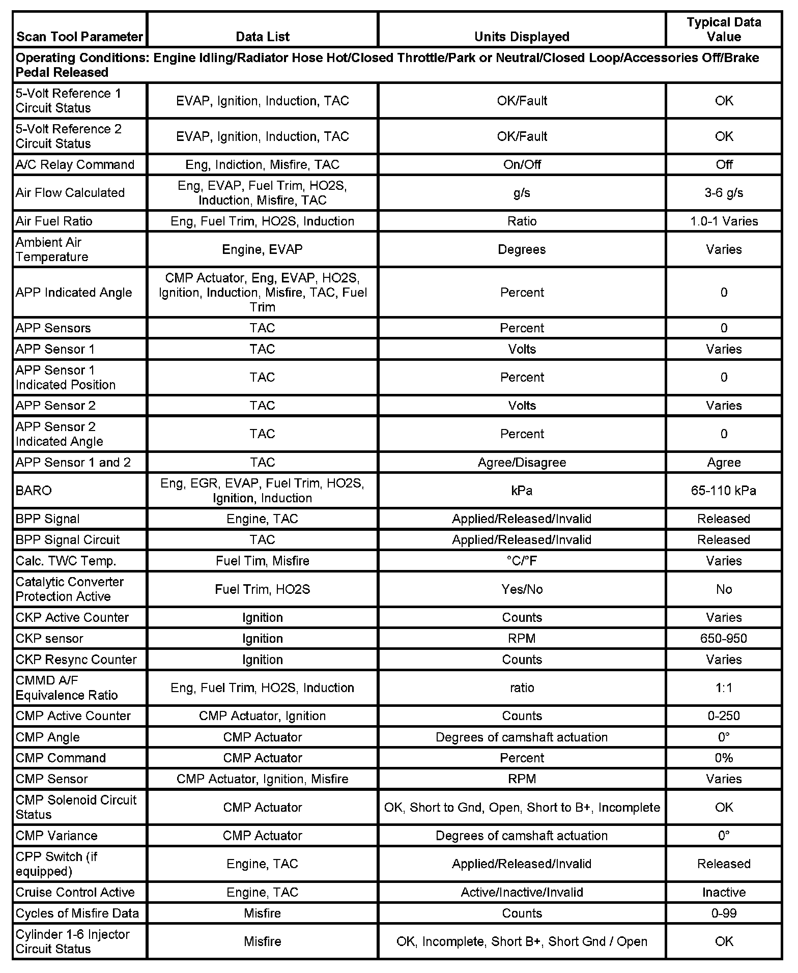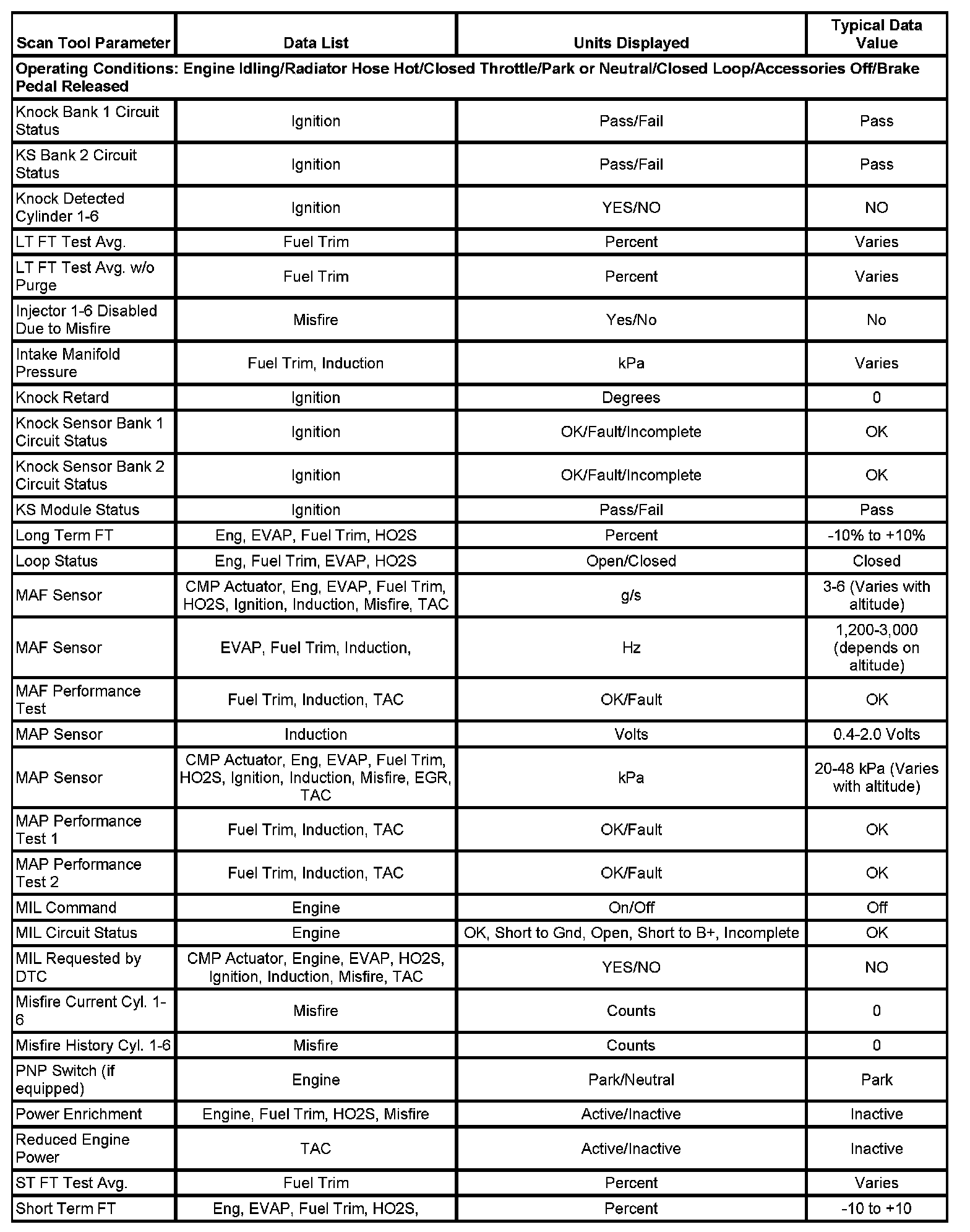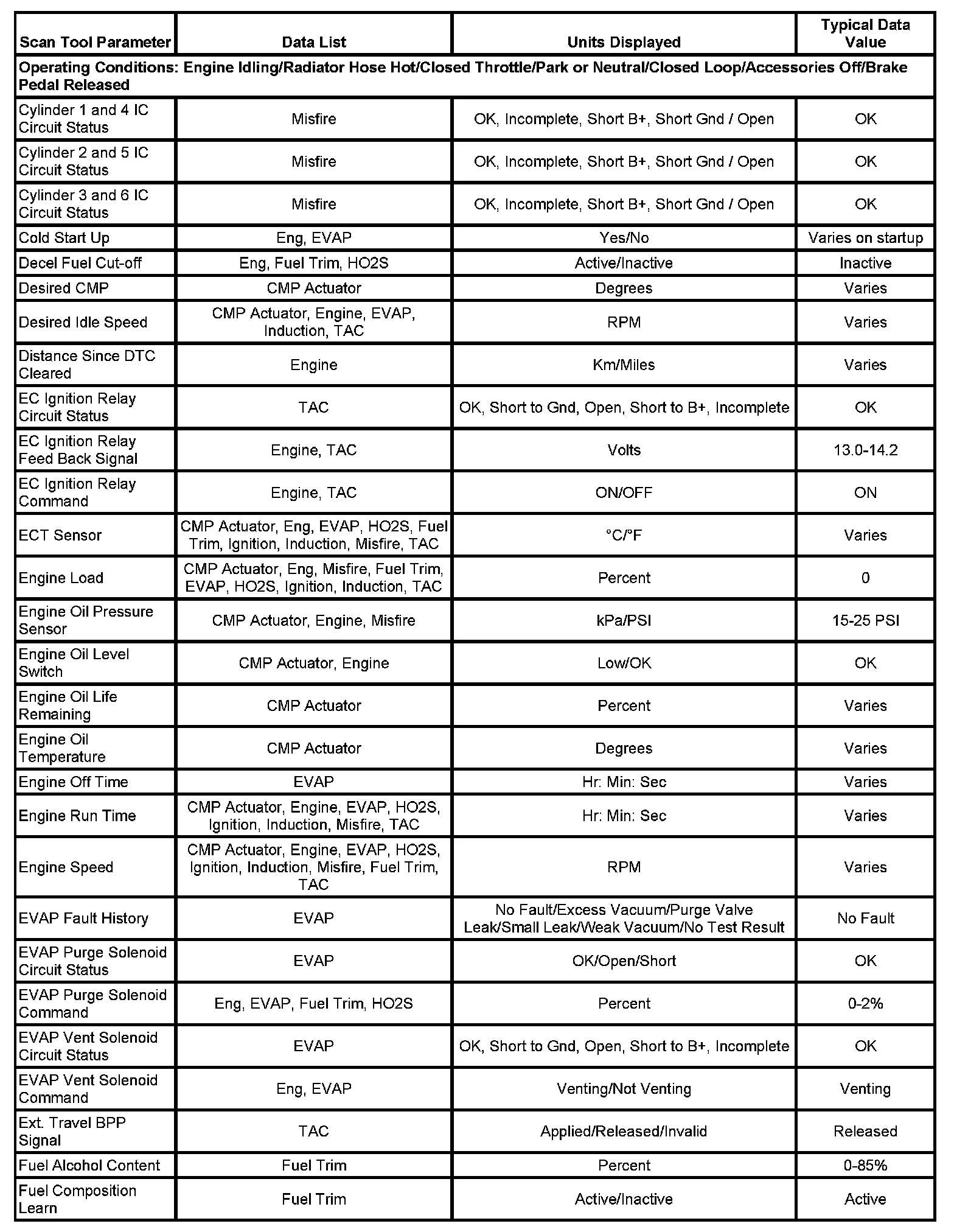 The Engine Scan Tool Data List contains all engine-related parameters that are available on the scan tool. The list is arranged in alphabetical order. A given parameter may appear in any one of the data lists, and in some cases may appear more than once, or in more than one data list in order to group certain related parameters together.