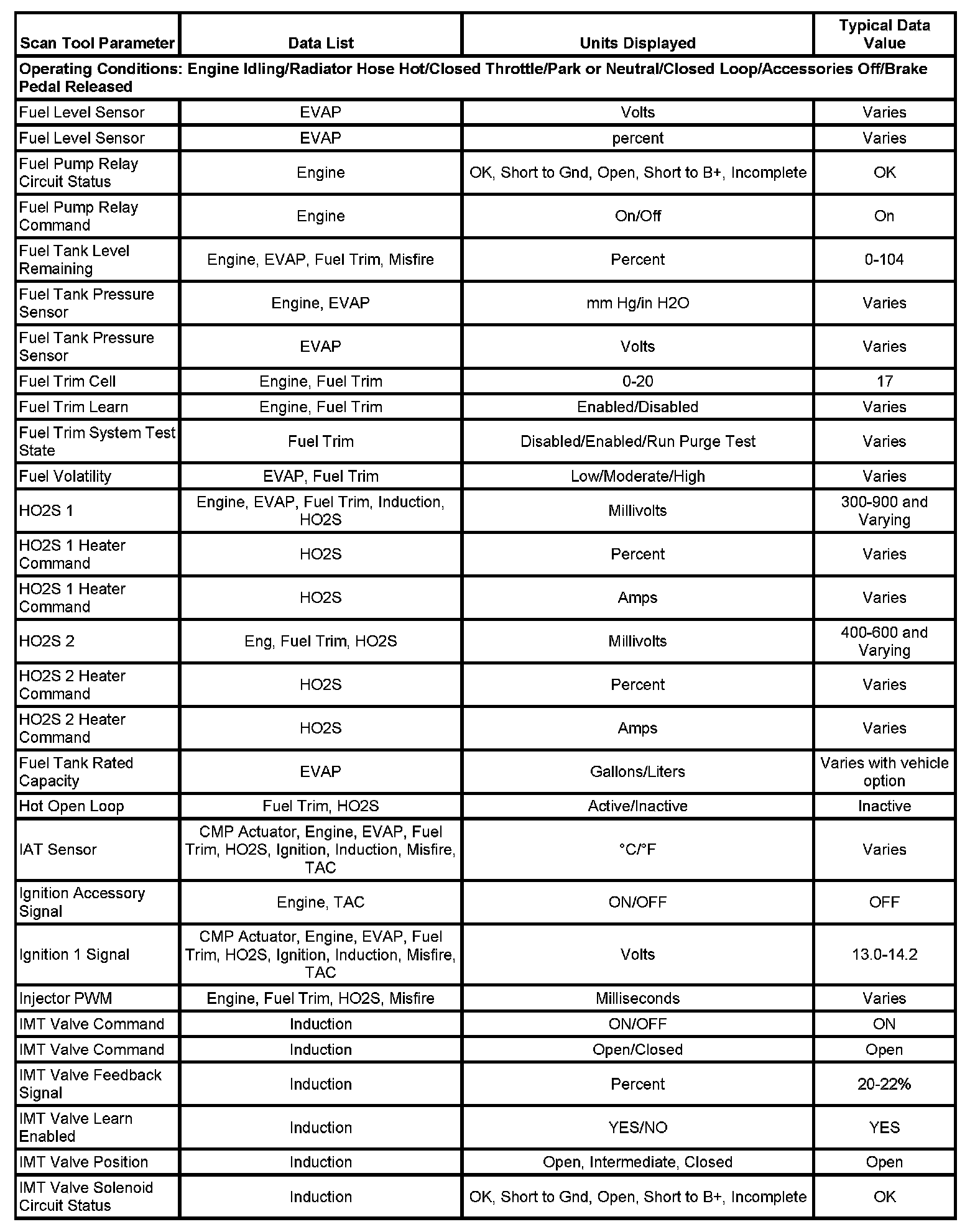 The scan tool values from a properly running engine may be used for comparison with the engine you are diagnosing. The Engine Scan Tool Data List represents values that would be seen on a normally running engine.