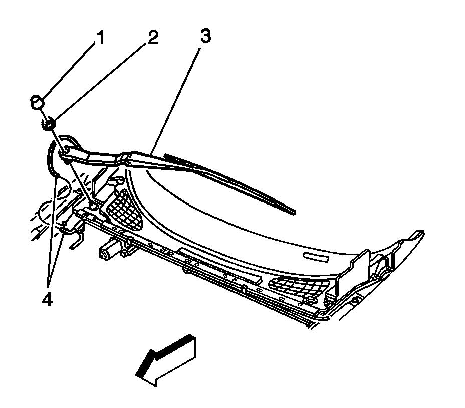 1. Position the wiper module (5) to the lower plenum in the driver side fender flange opening first.