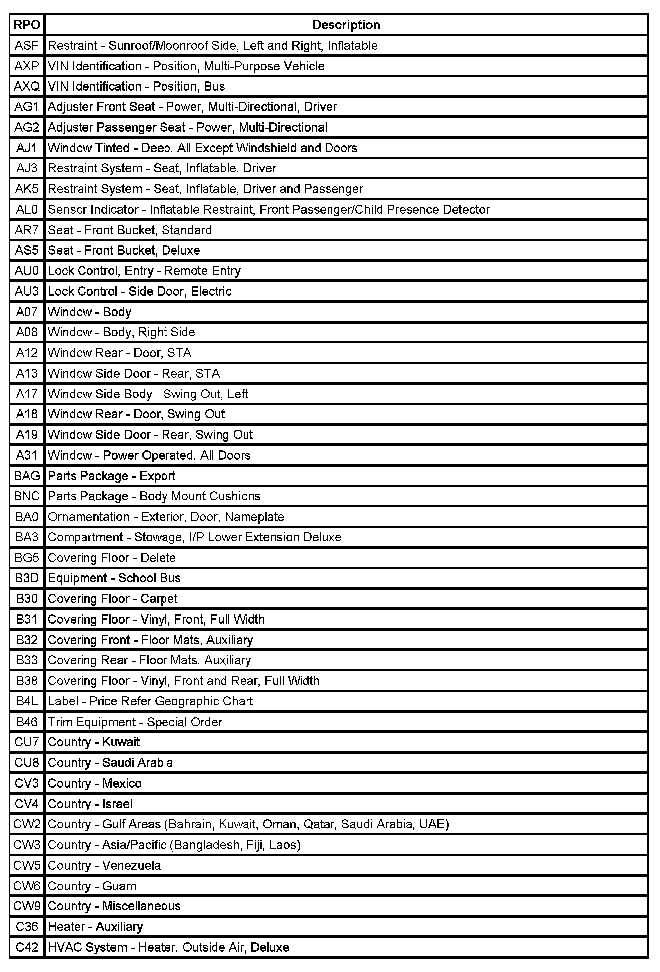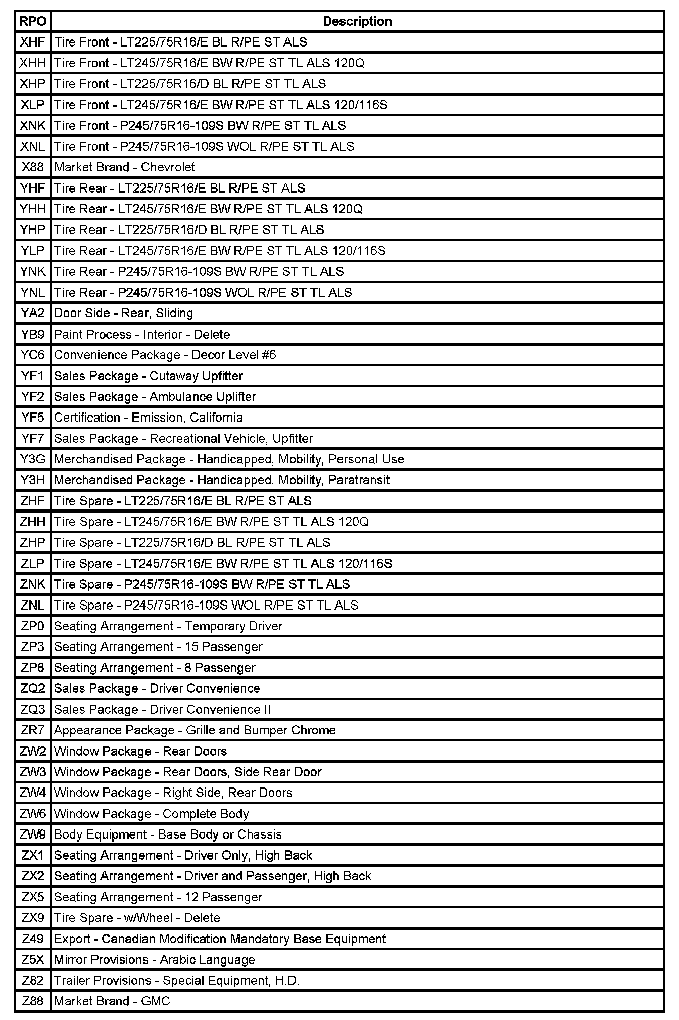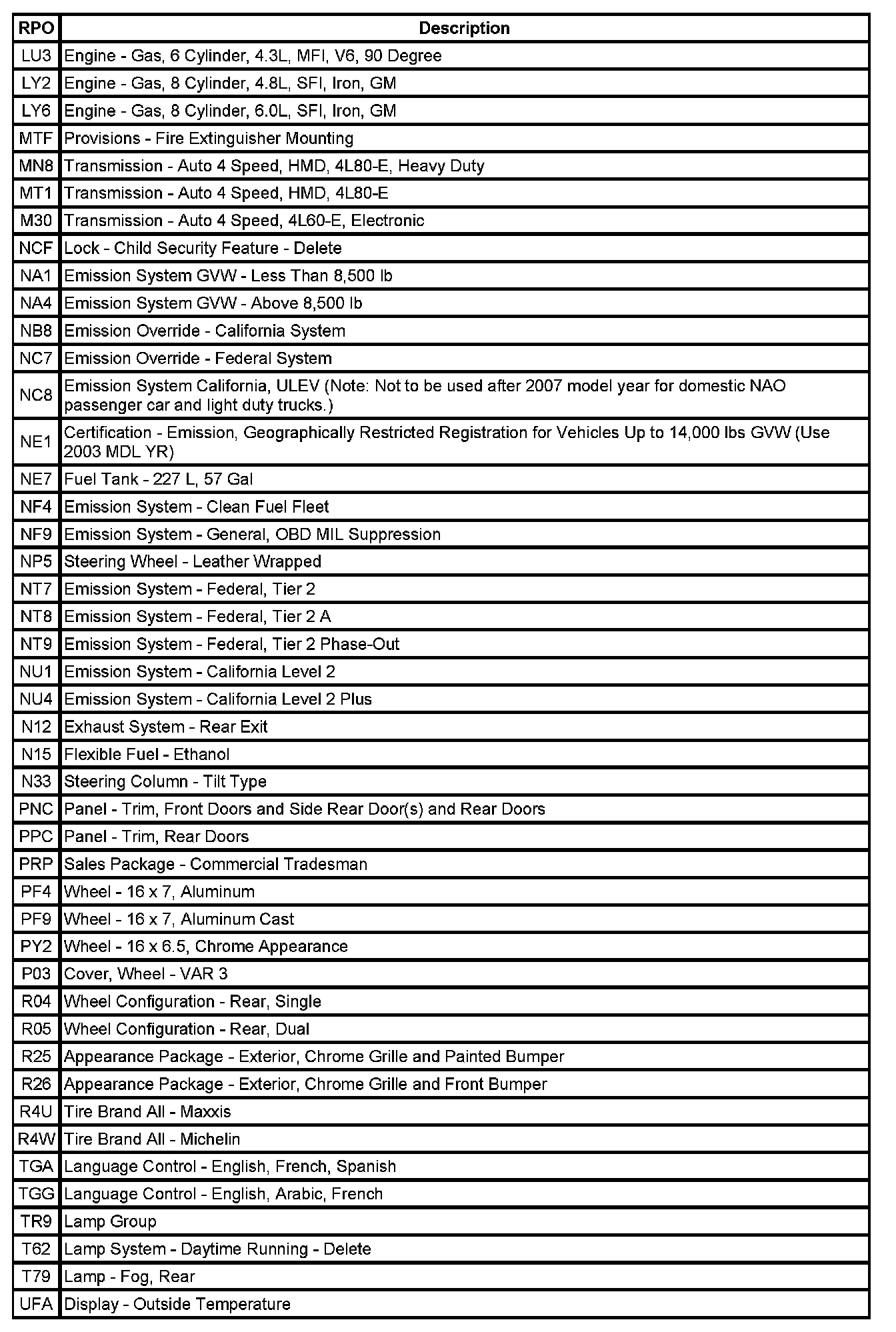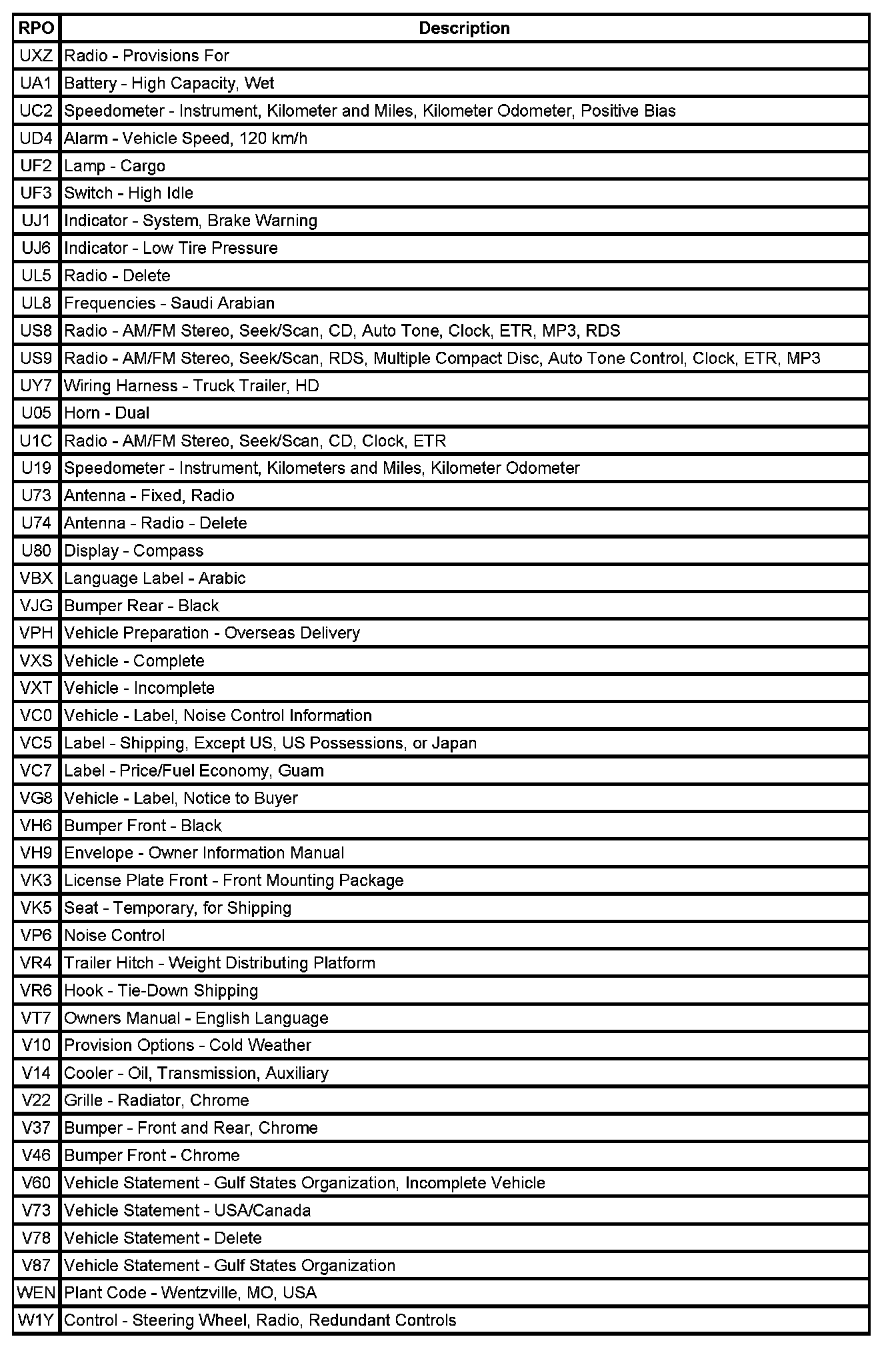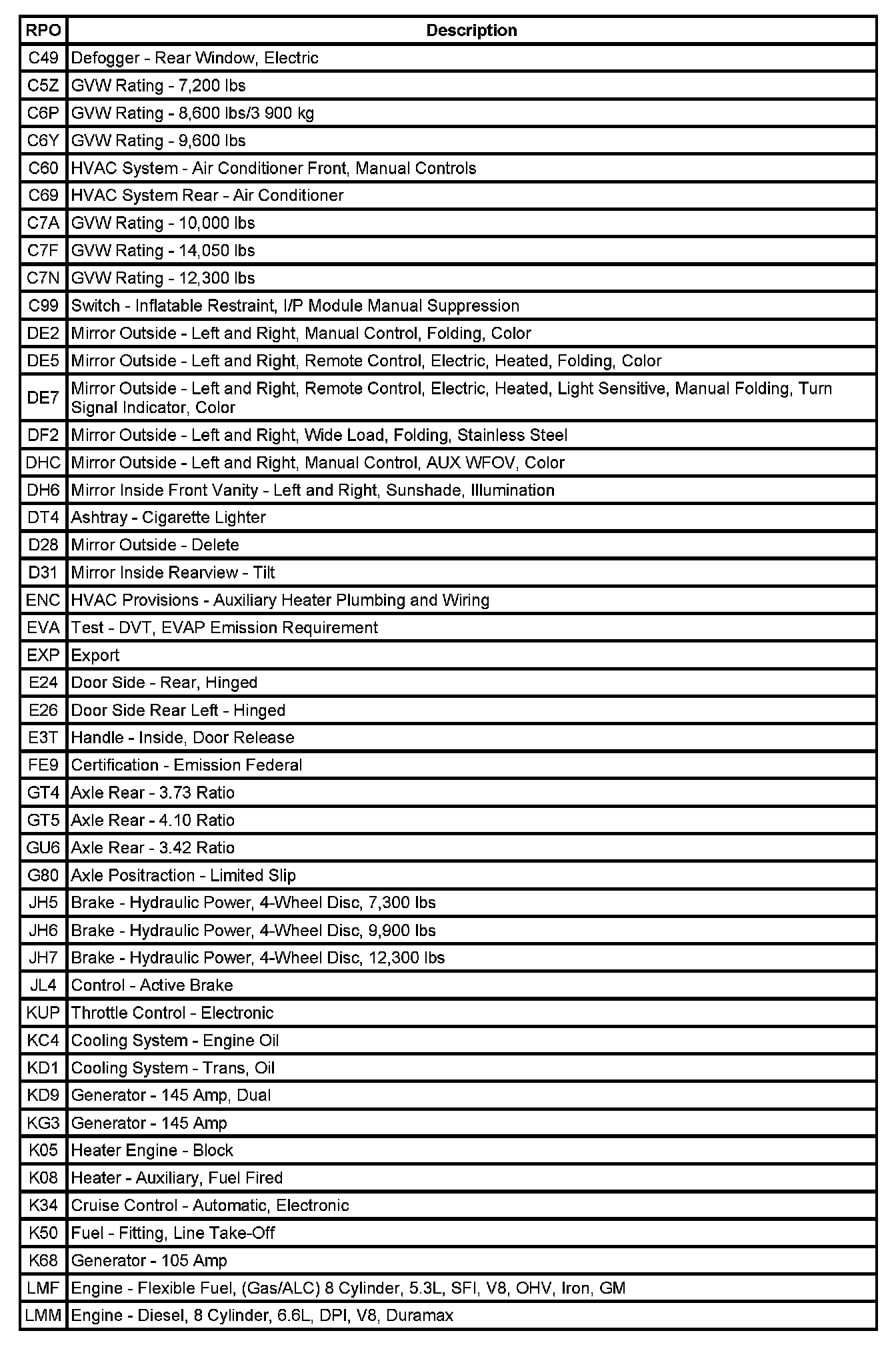 RPO Code List