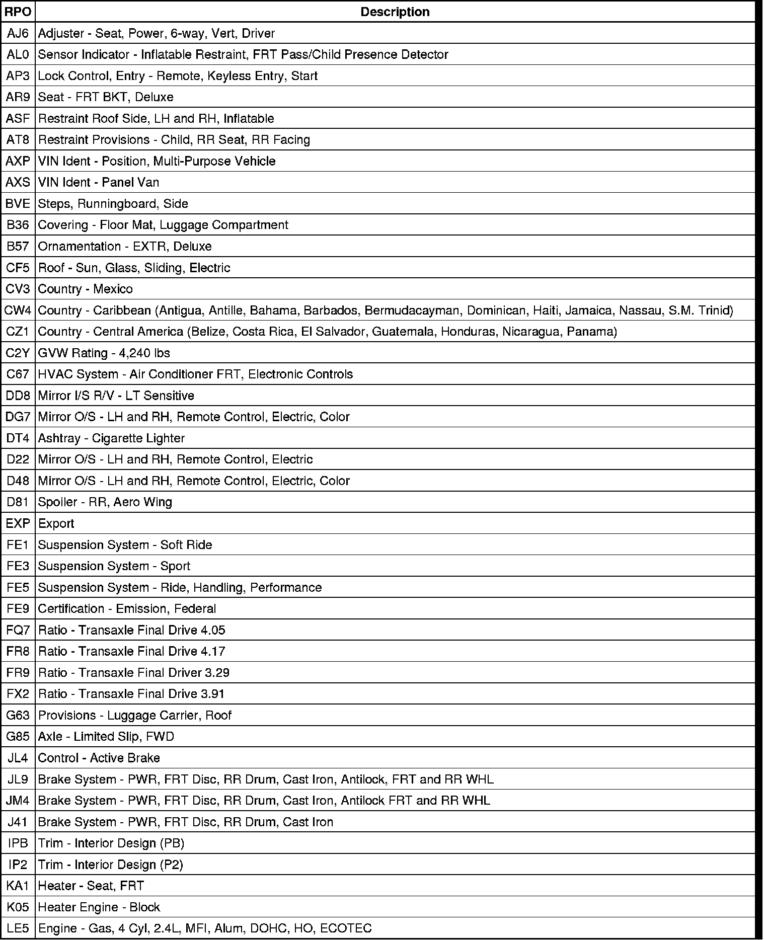 RPO Code List