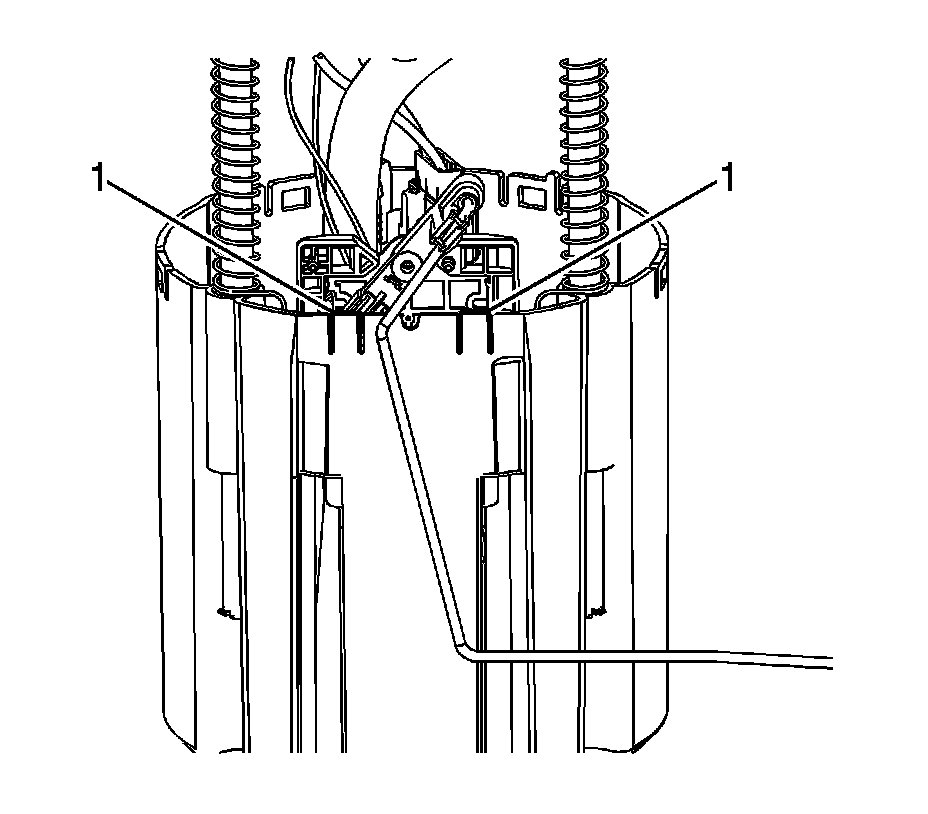 2. Using two flat-bladed tools, carefully pull both locking tabs (1) outward while simultaneously lifting the level sensor.