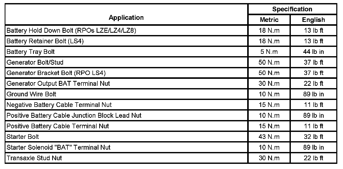 Starting and Charging: Specifications